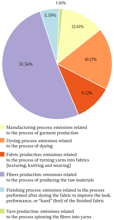 The majority of our emissions sit within Scope 3, under the category Purchased Goods and Services. We have calculated the emissions related to our different production processes, in order to properly evaluate which step is responsible for the highest impact. From this analysis it resulted that the key impact relates to the fibers production stage with 51.3% of the overall impact, followed by the dyeing process with 18.2%.
