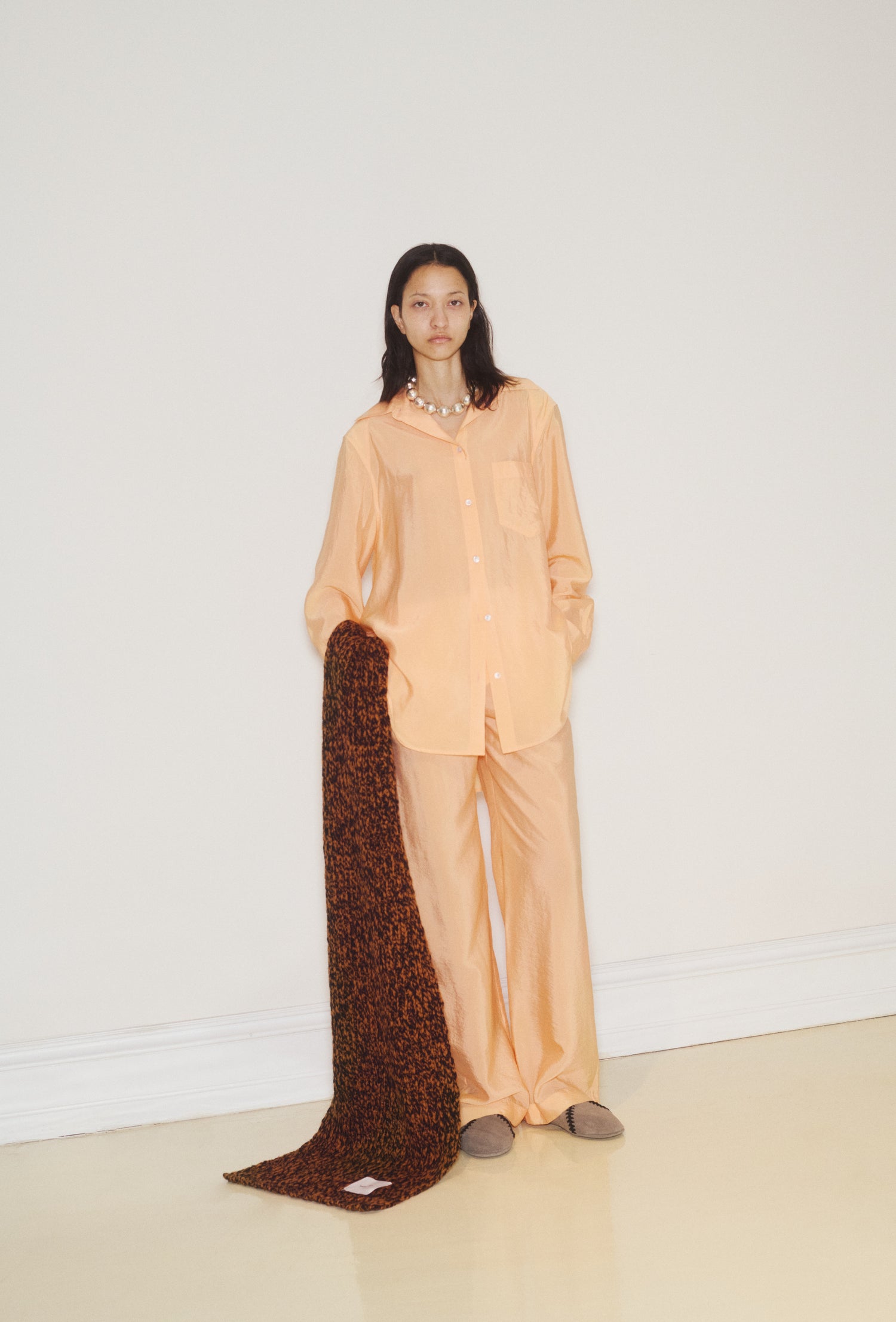 The collection reimagines classic design elements through the lens of evolution. Satin pieces feature folding and peeling-back elements, inspired by organic forms alongside soft scarf draping styled with structured pieces.