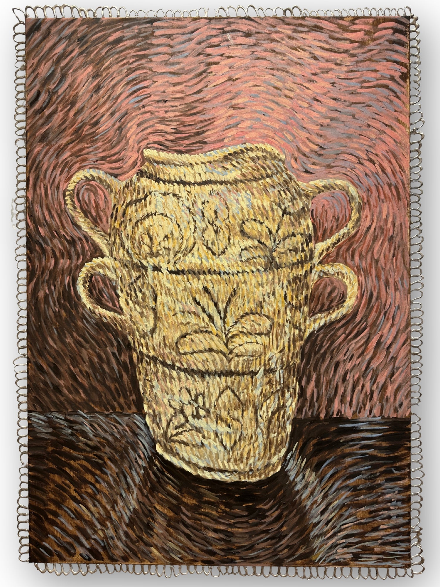 This work depicts a traditional Hungarian ceramic, discovered during Cochrane’s visit to the Hungarian House in New York. Researching this piece, the artist also sought to reconnect with her own Hungarian heritage that had previously remained unexplored. By painting the vessel on a large scale, Cochrane elevates a modest object to grand, embodying both cultural memory and personal lineage. The silver foil frame recalls the delicacy of lace doilies, folk embroidery, and other hand-crafted traditions - forms of ornament intrinsically tied to Hungarian culture. Lace, often made by elder women, becomes a symbol of intergenerational knowledge. In dialogue with Nanushka’s own menswear collection, which incorporates lace, the work honours the quiet strength of elder generations while reimagining tradition through a contemporary lens.