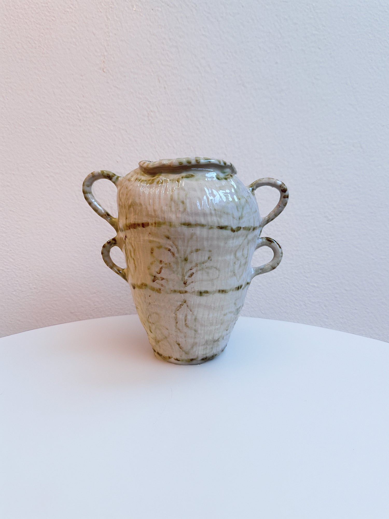 In Hungarian folk narratives, tulips often appear in textiles and artworks as symbols of womanhood. Cochrane draws on this tradition, depicting tulips at varying stages of bloom to represent different phases of life: the closed bud representing as a young girl, the bloom as a young woman, the half-open flower as the stage of pregnancy, and the fully open tulip as grandmotherhood. By uniting these forms within both the handmade vessel and its painting, she evokes the generational cycle of women - each stage carried within the body, each life blooming into its own being.