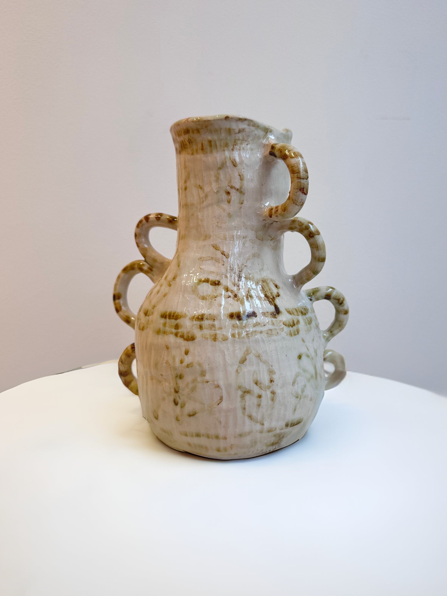 The ceramic vessels in this body of work explore the idea of woman and mother as vessel - each unique in shape, curve, and presence, yet all capable of carrying multitudes. Through them, Cochrane seeks to make sense of her own story as a woman and mother. Working across both painting and pottery, she mirrors sculpted forms with their painted depictions, placing her vessels in dialogue with traditional Hungarian ceramics. Adapting inherited motifs with contemporary symbols, she layers humour and cultural reference into the work. In doing so, she bridges personal experience with the fragments and questions of her Hungarian heritage.