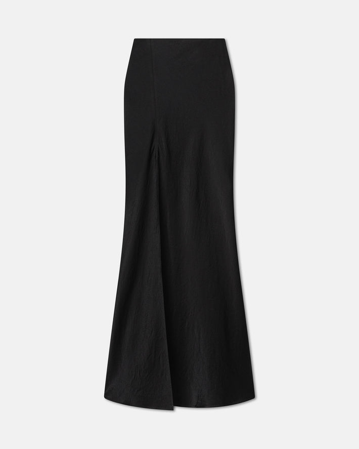 Shop nowInfluenced by ‘90s minimalism, the Harlow skirt is cut from crinkled satin that pools beautifully over the feet with a high front slit. Effortlessly elegant and refined, it sits high on the waist and comes in classic black.