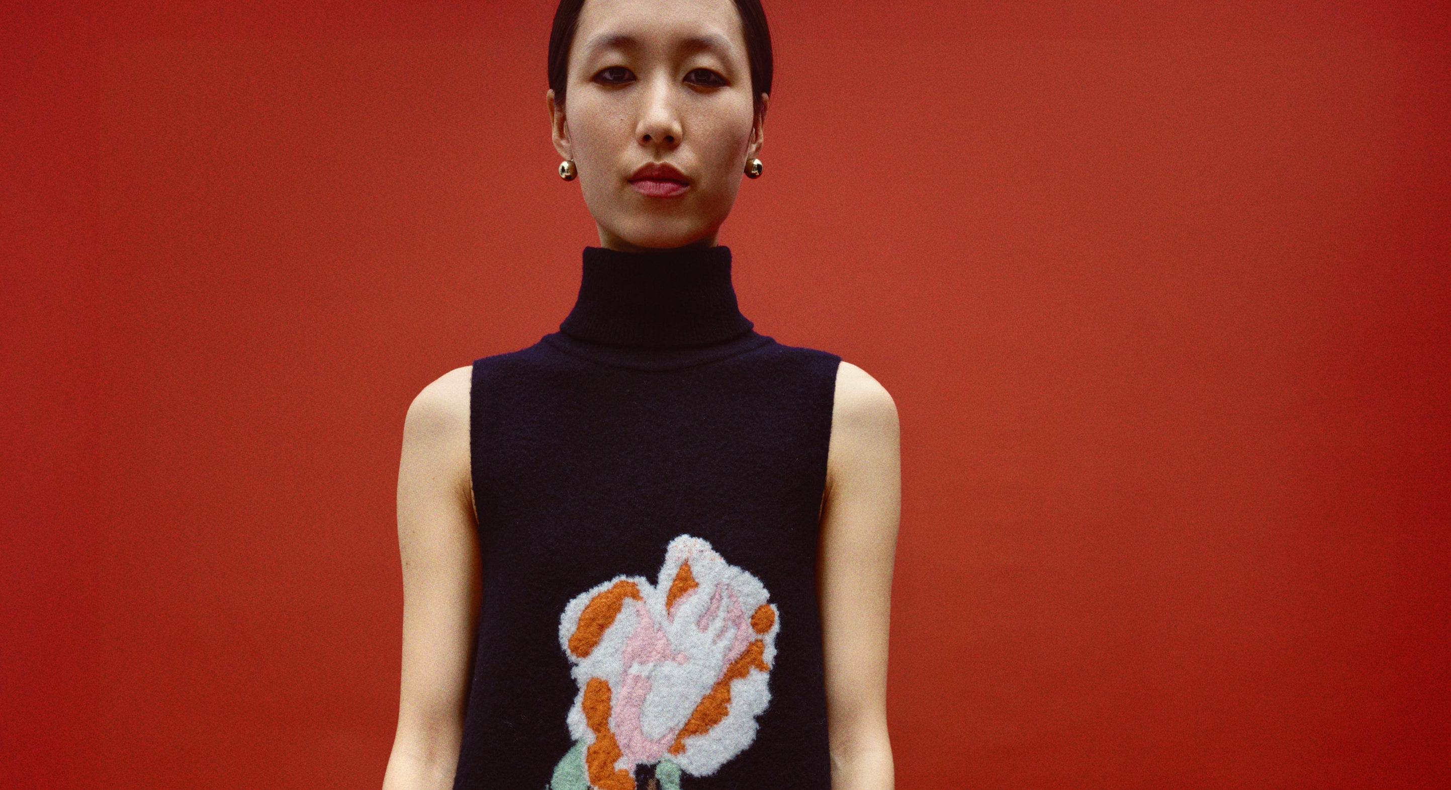 Heavily inspired by vintage Hungarian postage stamps, the vibrant rose motifs are woven into twill silk and showcased on knitwear with the elbow positioned motifs.