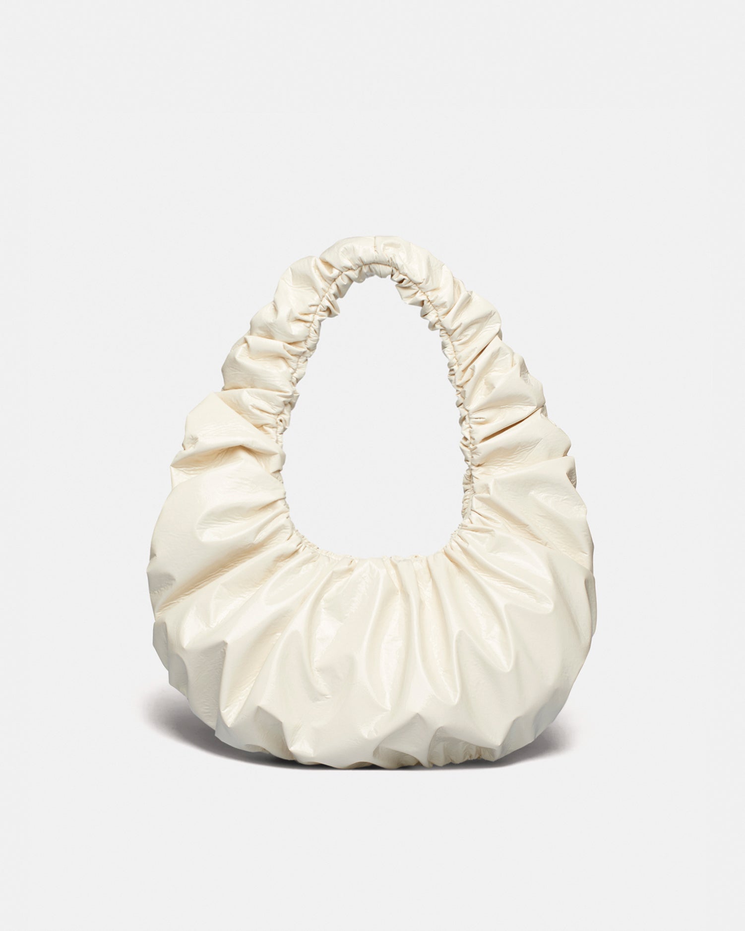 Made from our high-shine patent alt-leather, the Anja bag is tightly scrunched yet smooth to the touch. It has a curved handle that's long enough to be worn over your shoulder or in the crook of your arm.