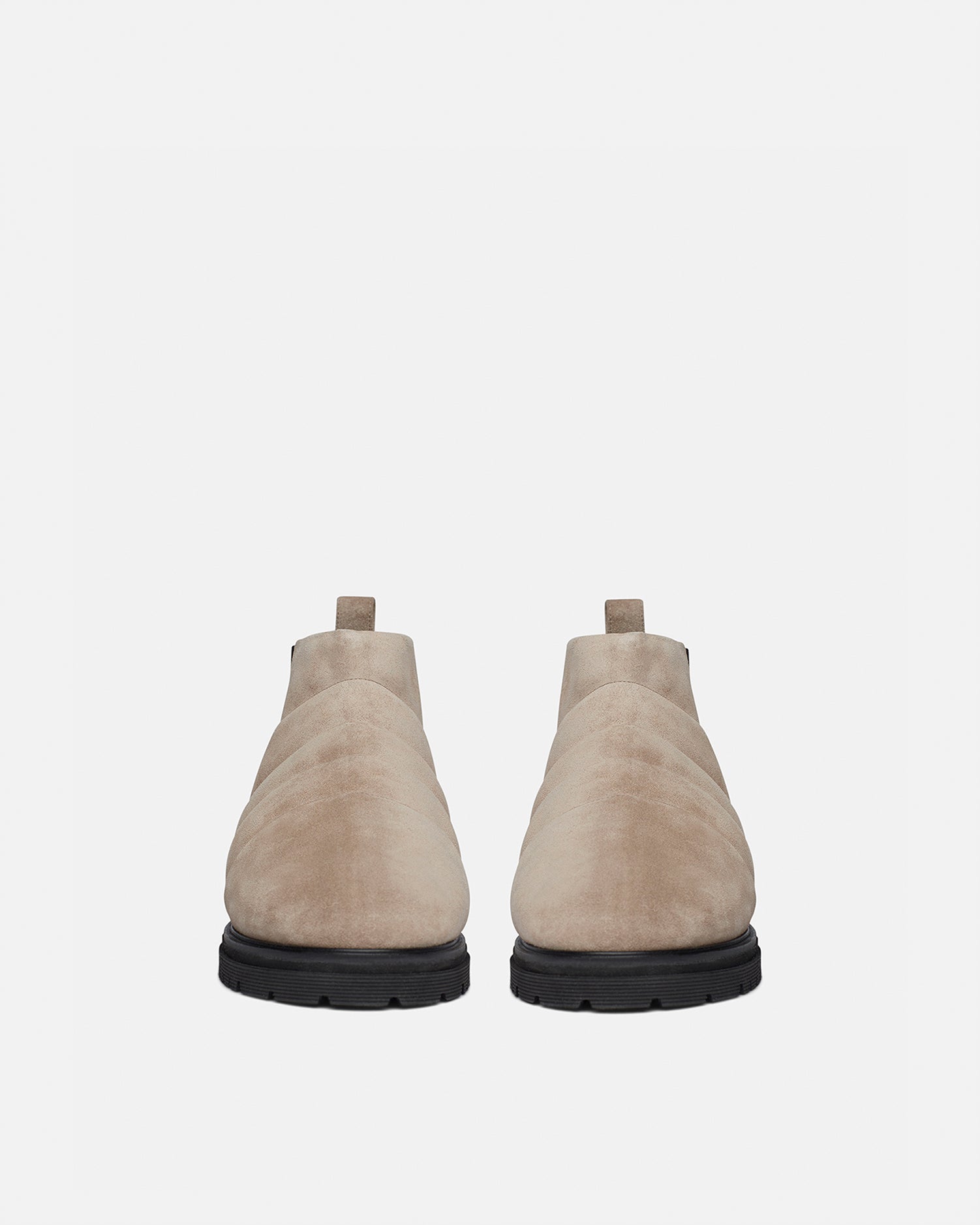Padded stone suede gives the Bede boots a contemporary feel. Grounded with a heavy tread sole and finished with a rounded toe, elasticated sides and pull tabs allow for pull-on, kick-off ease.