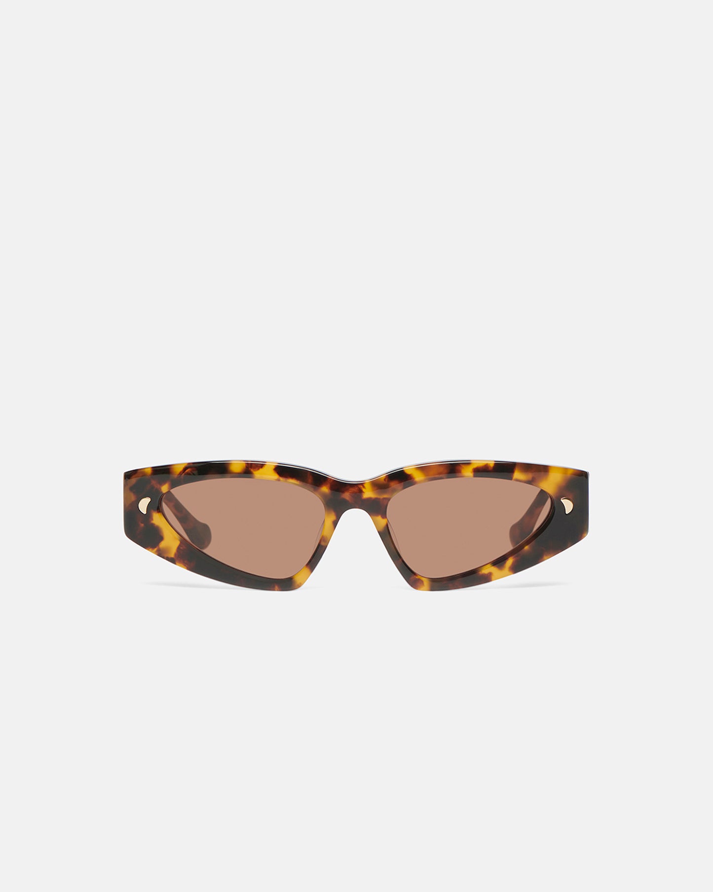 The Crista sunglasses are defined by a futuristic D-frame shape accented with signature gold ‘N’ motifs at the temples. In timeless dark amber, they are crafted from bio-plastic and accompanied by a protective pouch made from offcuts of our signature alt-leather.