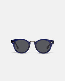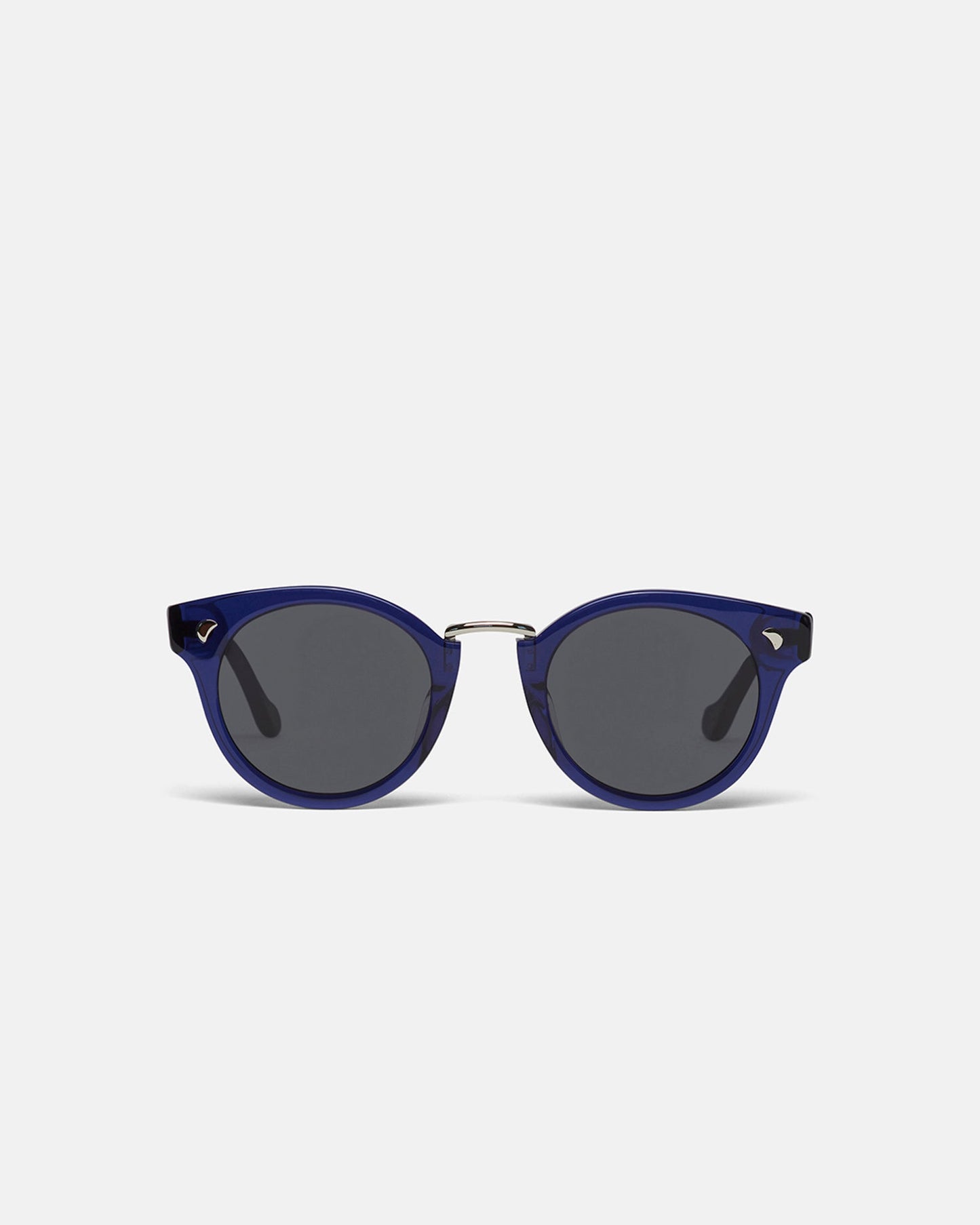 The Duy sunglasses have an expressive round shape that feels at once modern and retro. They have black lenses fitted within translucent navy plastic frames - both made with bio-based materials - and are complete with a silver-tone bridge and detail.