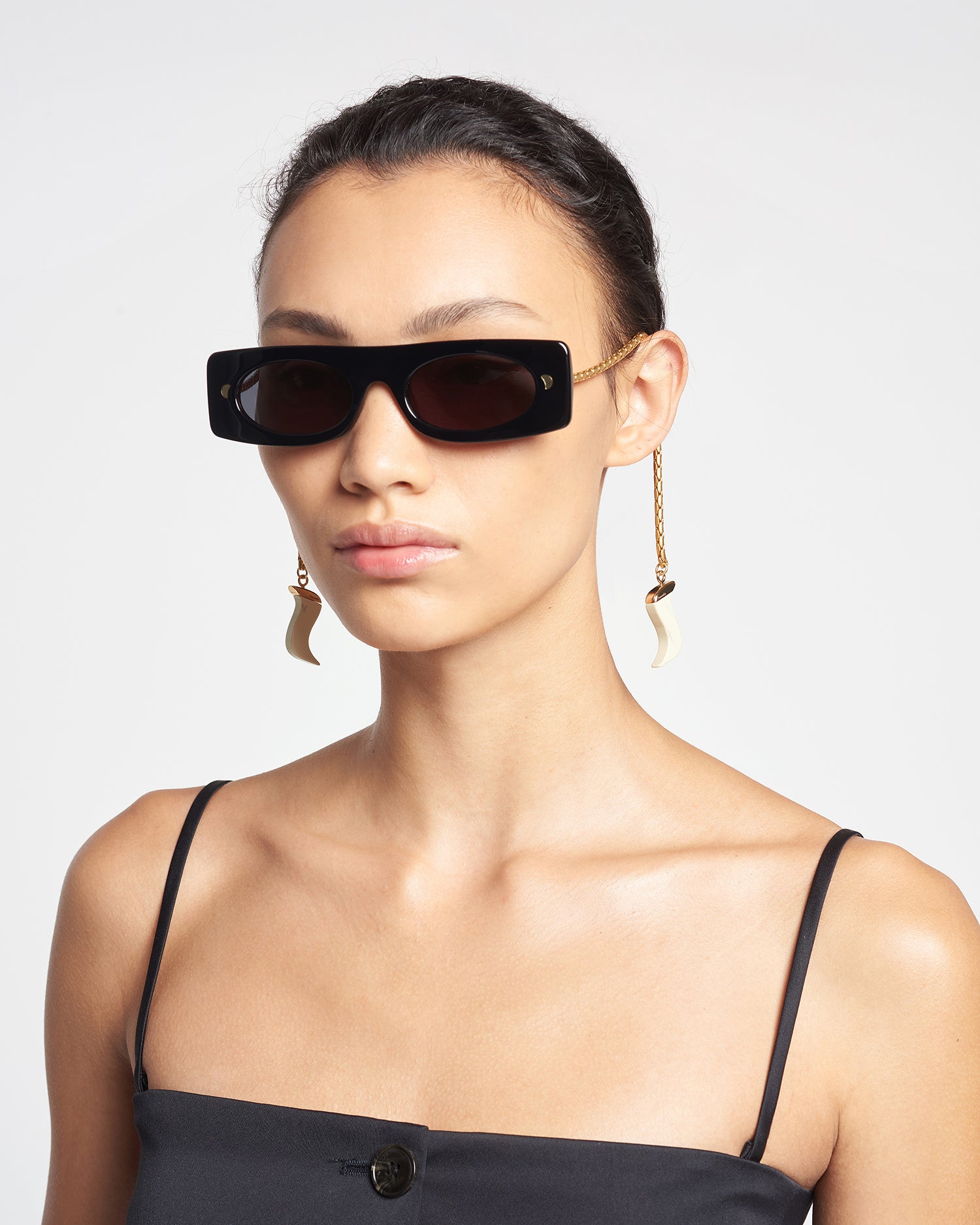 The Gabri sunglasses feature a rectangular frame distinguished by gold-tone chain arms and an N-shaped charm.