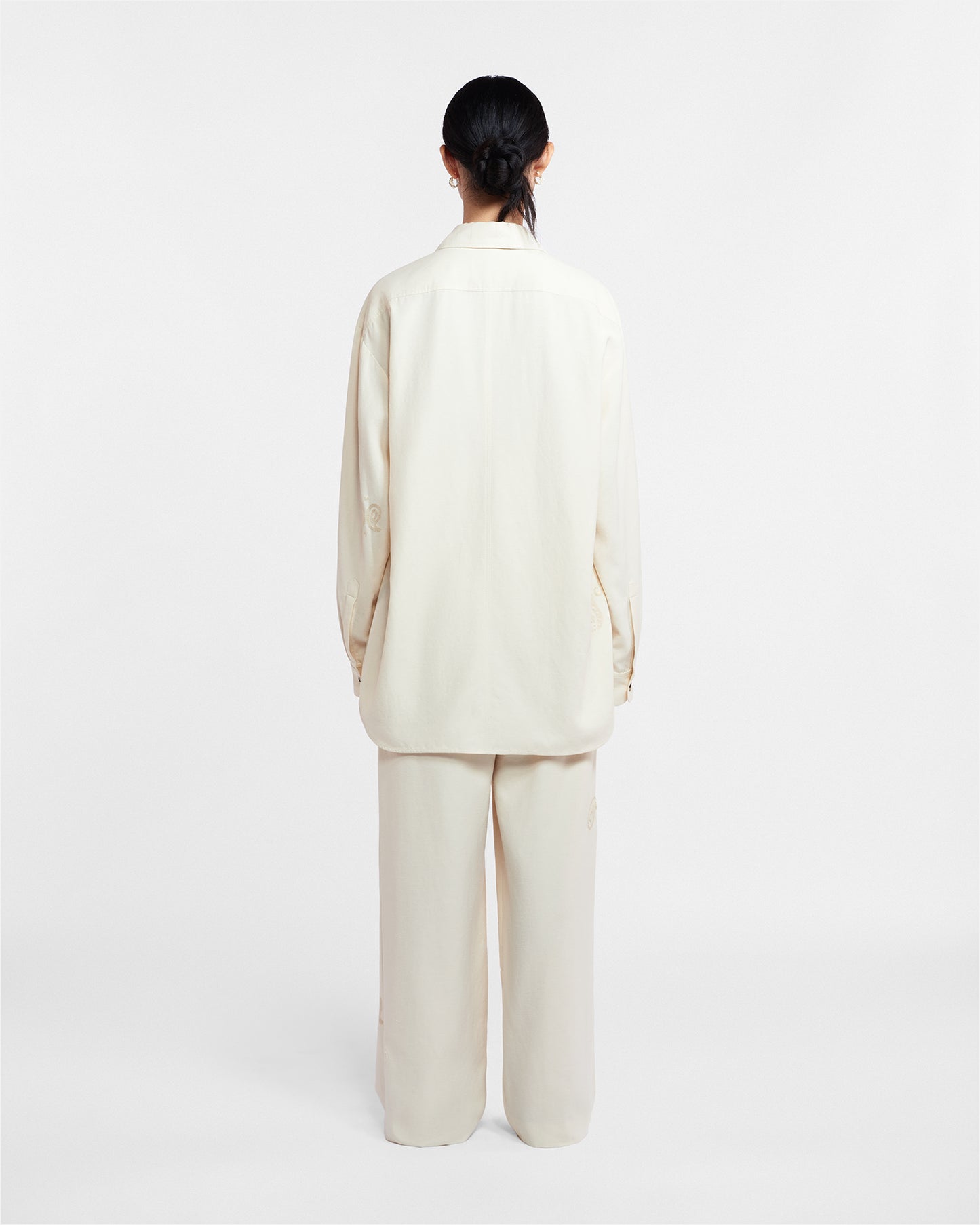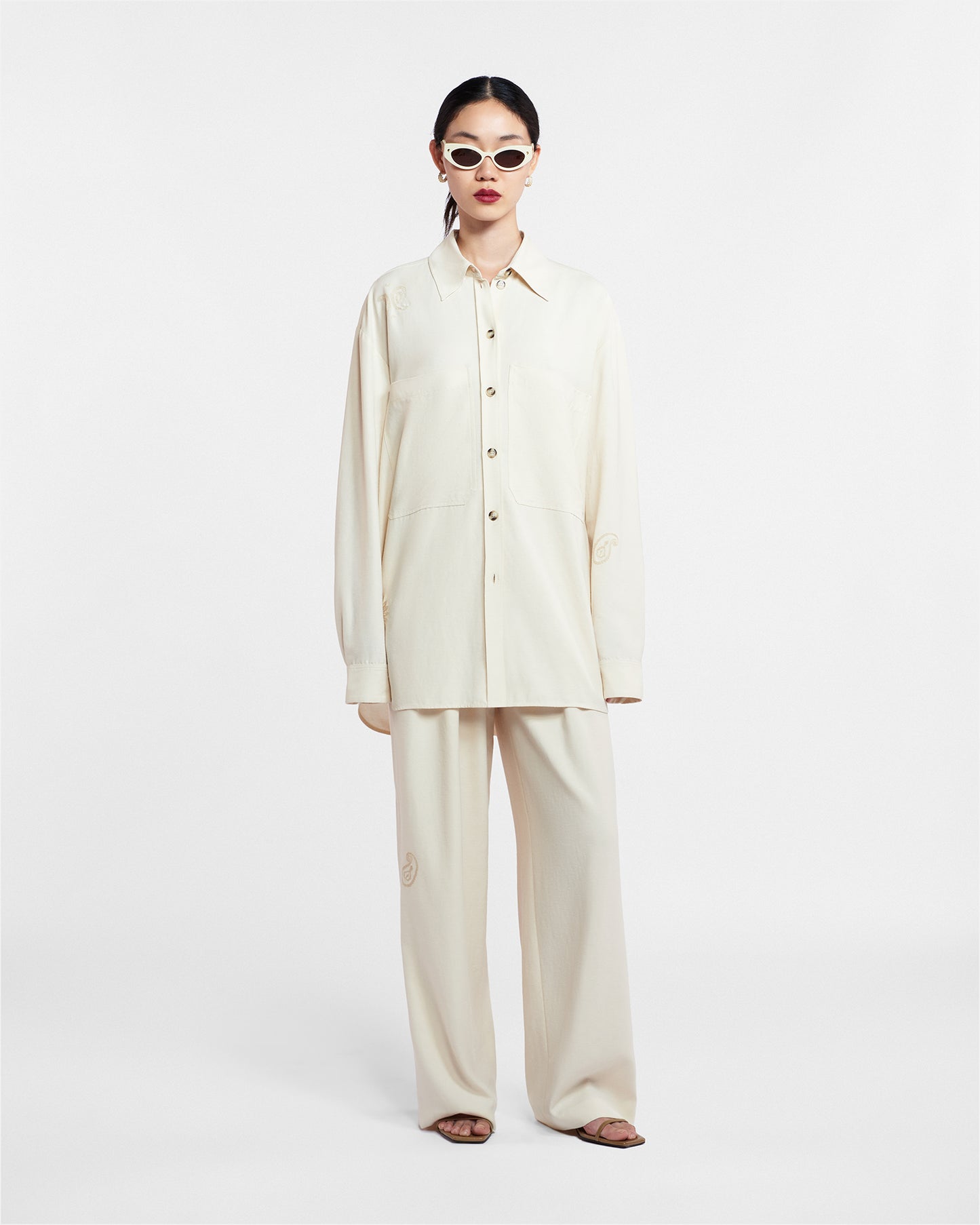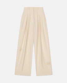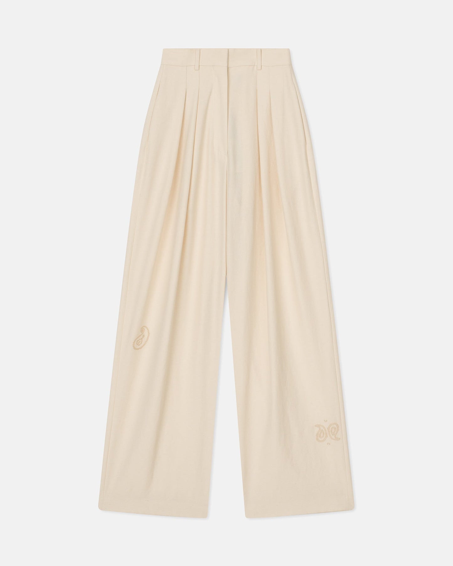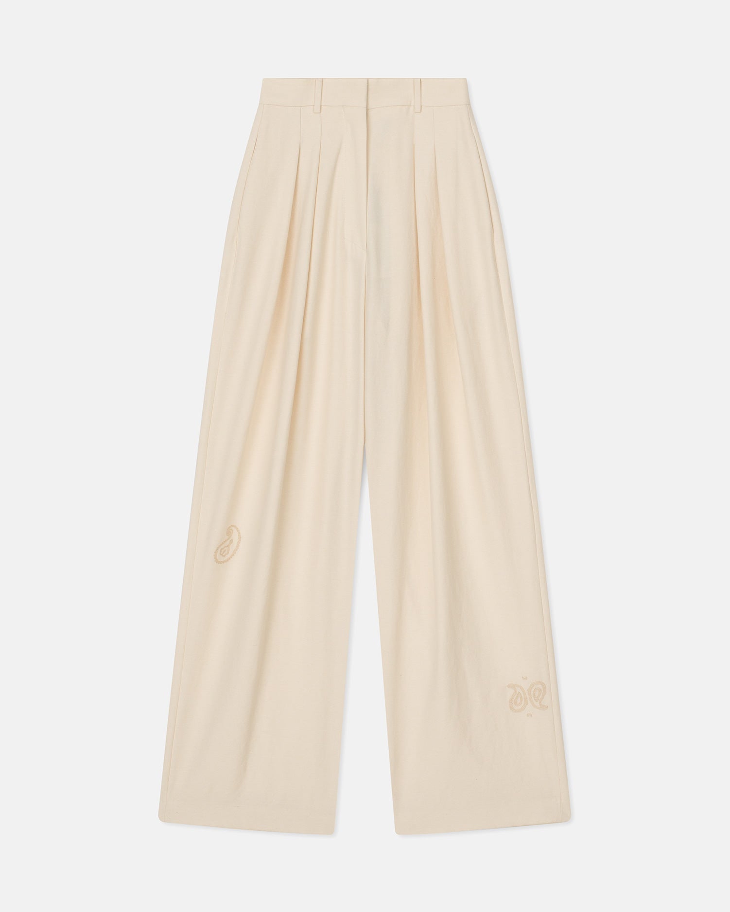 The Marika pants are crafted from a lightweight fabric that’s slubbed for texture. They sit high on the waist with sharp pleats and pool elegantly to the ankles. Embroidered motifs are a subtle nod to our long-standing fascination with traditional craft.