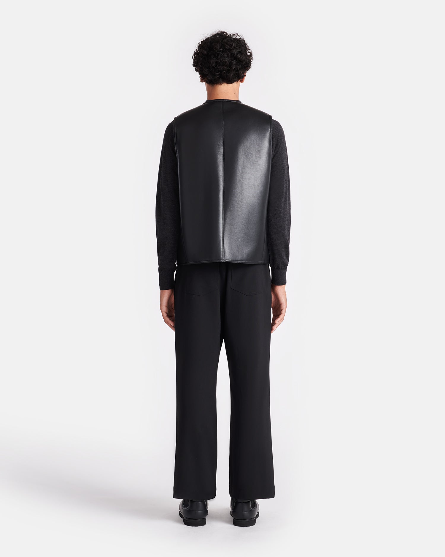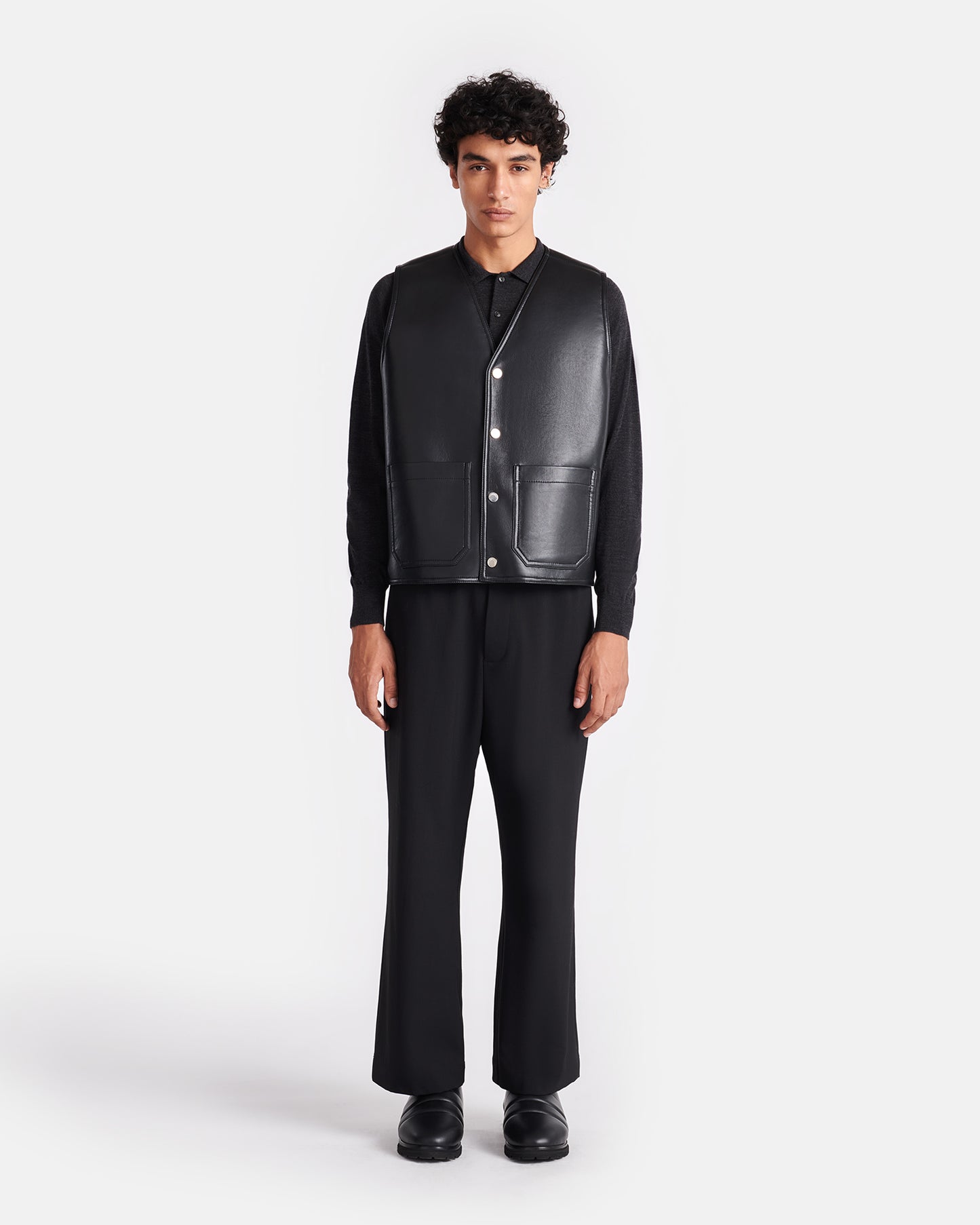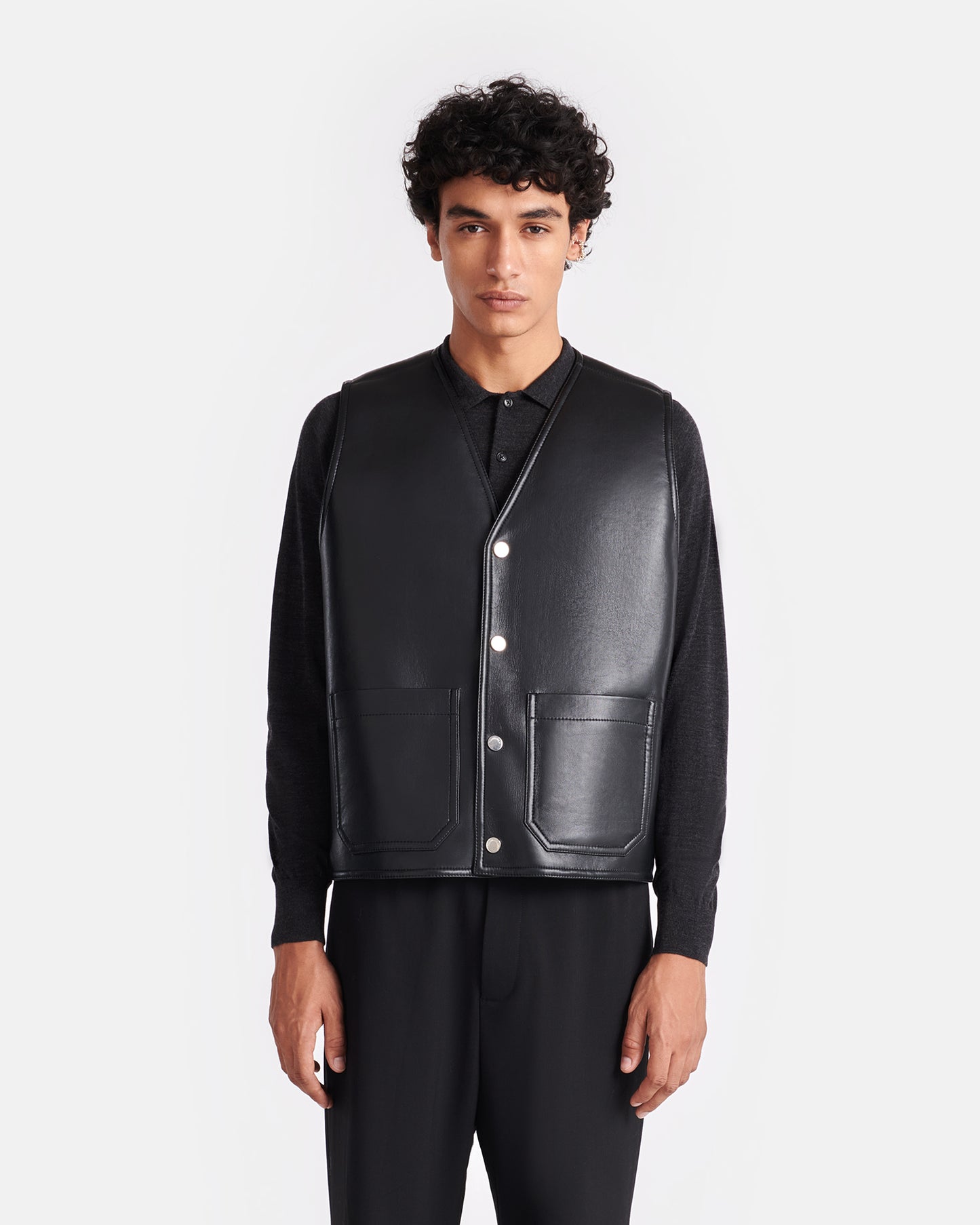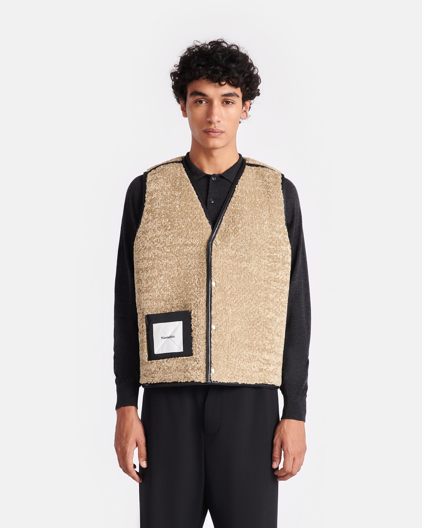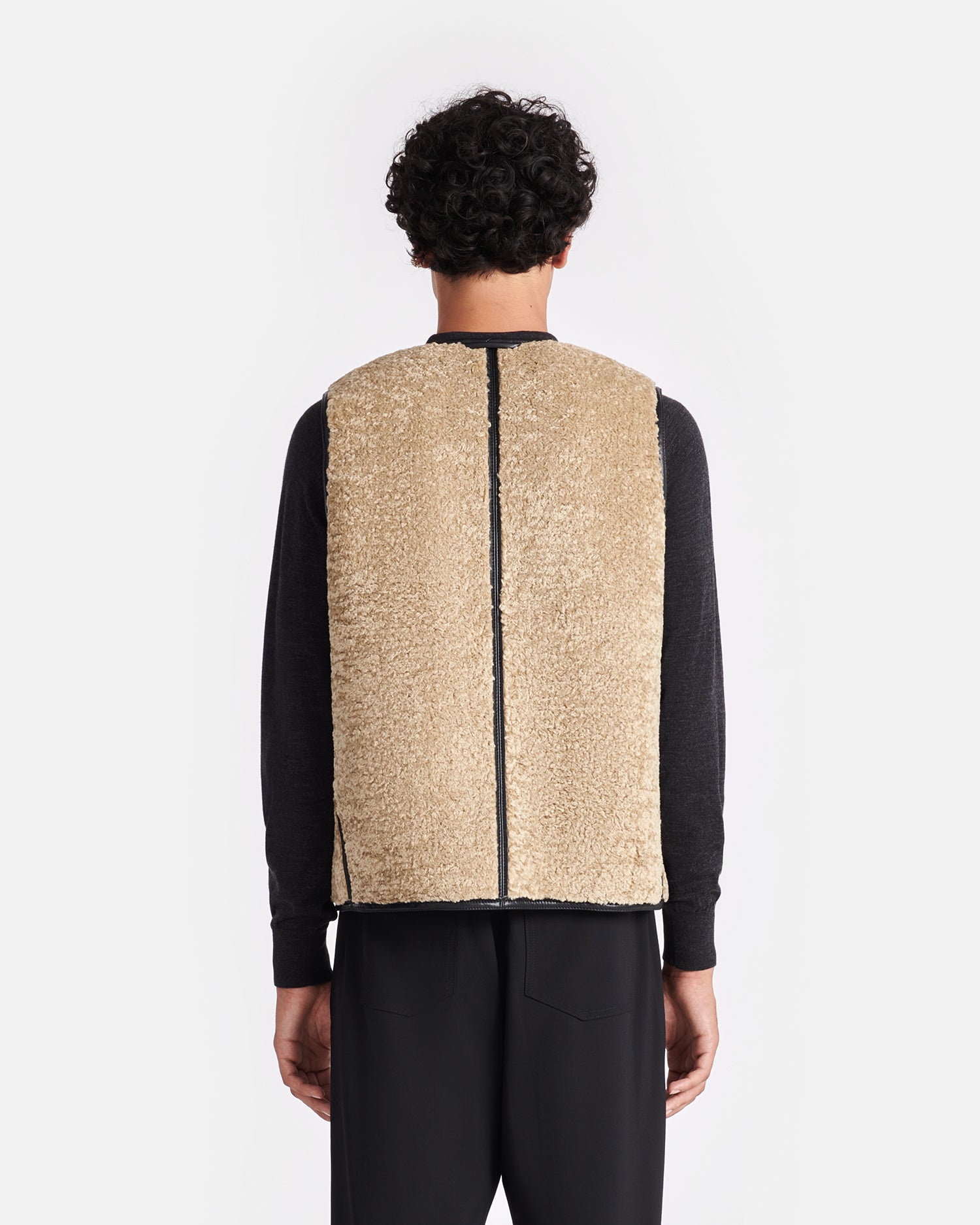 The Leevi vest is crafted from bonded shearling – switch between the smooth black or textured cornstalk sides for styling versatility. Snap fastenings and patch pockets are added functional details.