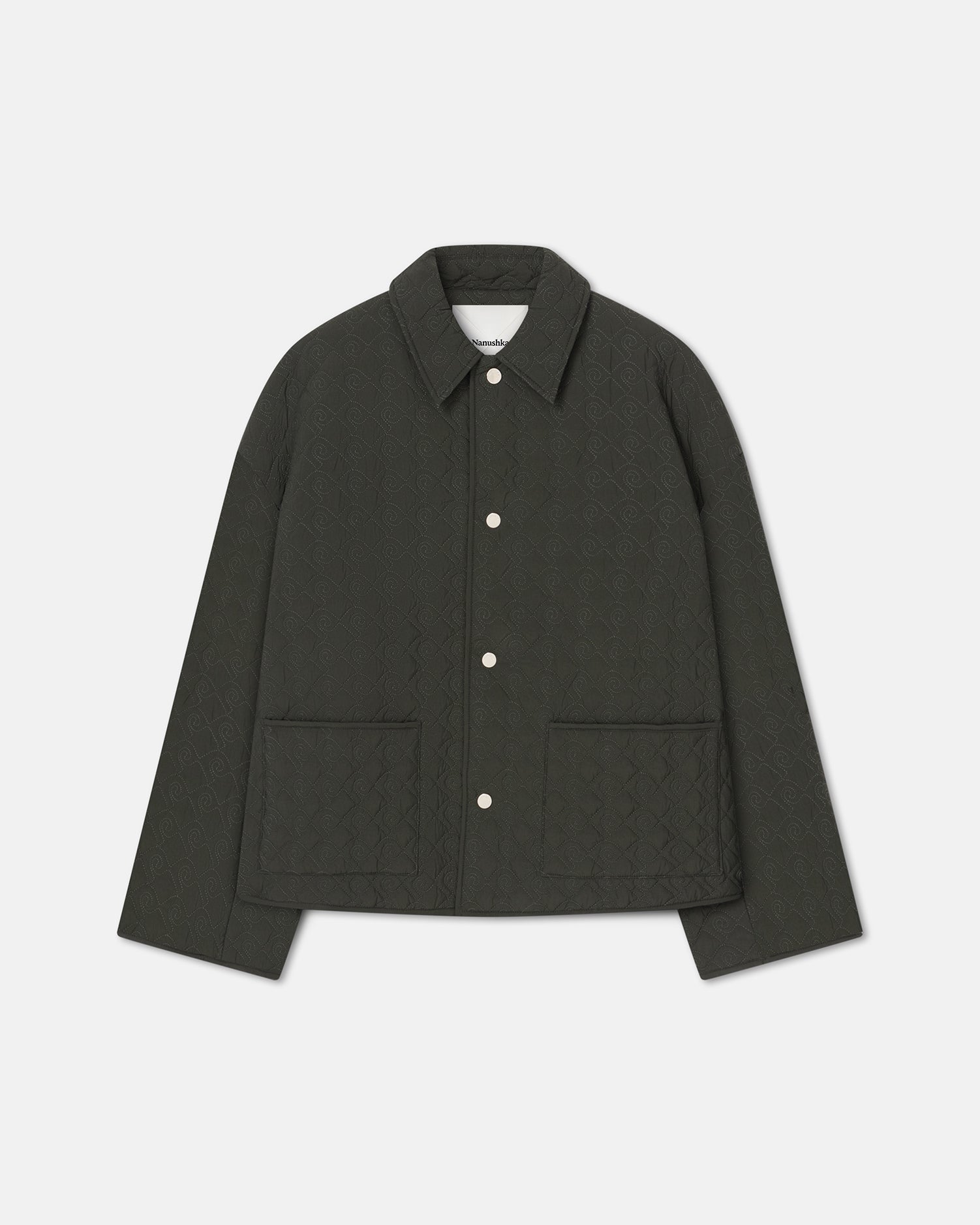 Fabric manipulation creates something unexpected this season. Made from quilted nylon, the textured Gibbson jacket becomes a fresh, modern take on classic workwear silhouette. The fit is boxy, with a pointed collar and capacious waist pockets.