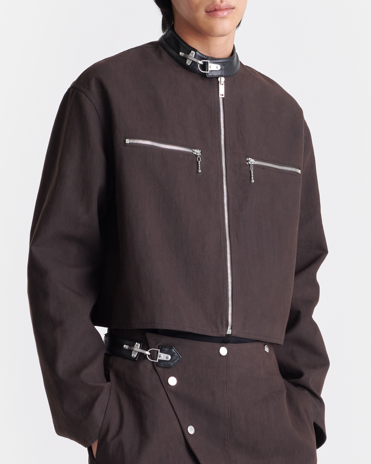 The Petro jacket is inspired by classic Biker styles – note the hook and buckle detail at the collar, as well as the gleaming zip-fastening hardware. It’s made from dark-brown wax cotton for a hard-wearing finish.