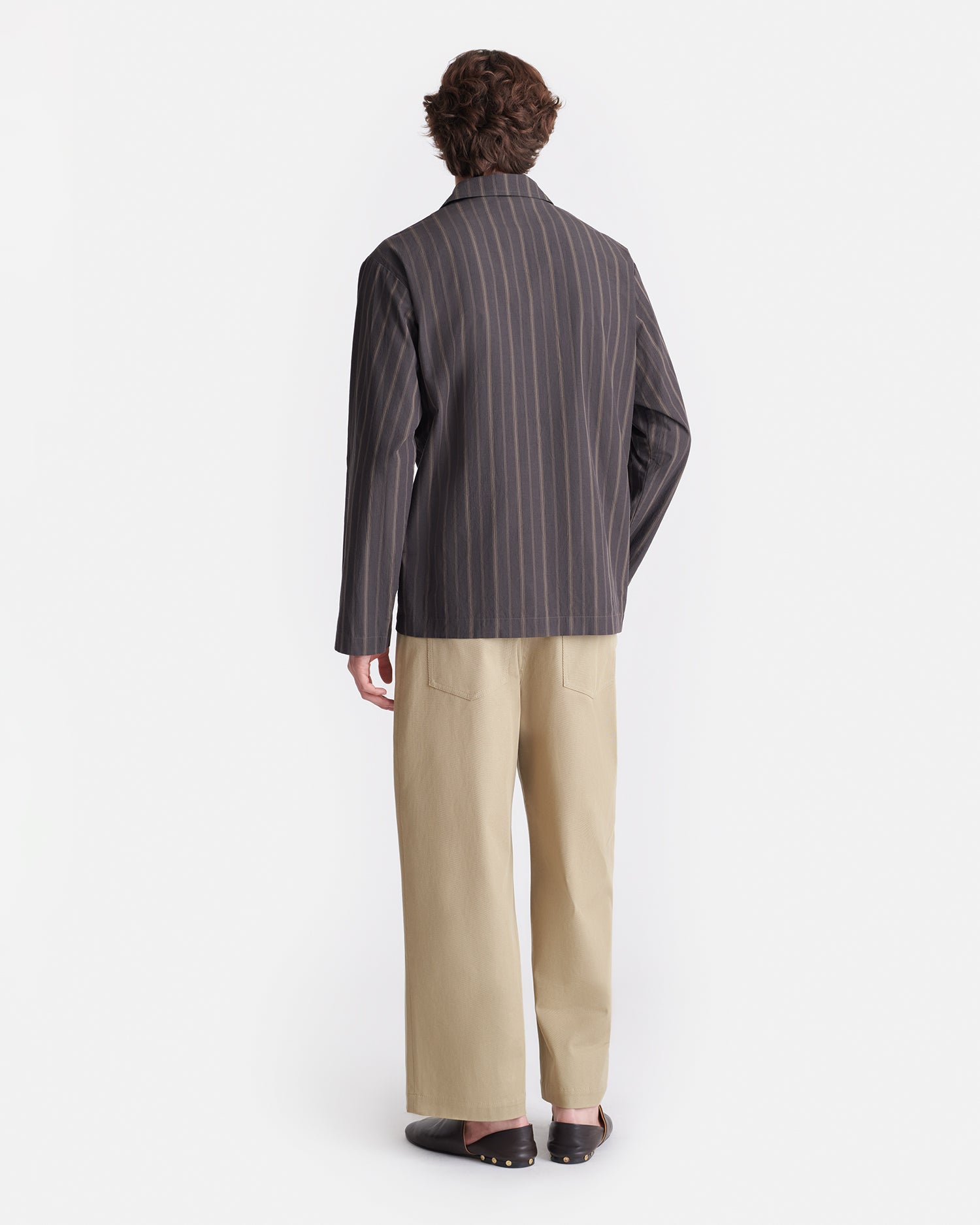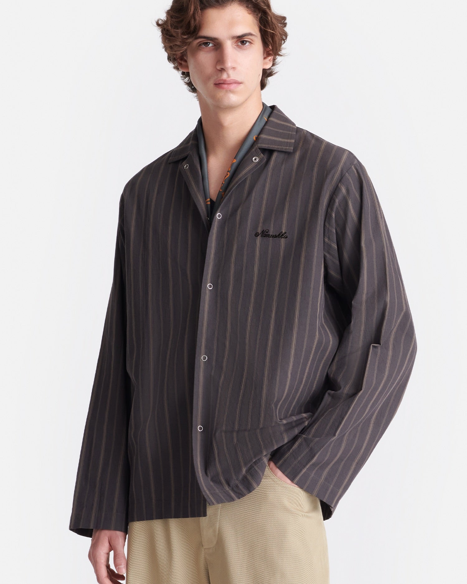 The Shaun shirt has the ease and elegance of classic pyjama styles, but is made from our signature suiting fabric in a washed-black tone for something more utilitarian. It’s finished with stripes and a chest pocket.