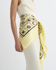 The Miani scarf is decorated with our signature Kopjafa print, drawing on our Hungarian heritage. Made from silk, it can be styled endlessly, from around the neck and shoulders to looped around the handle of a tote.