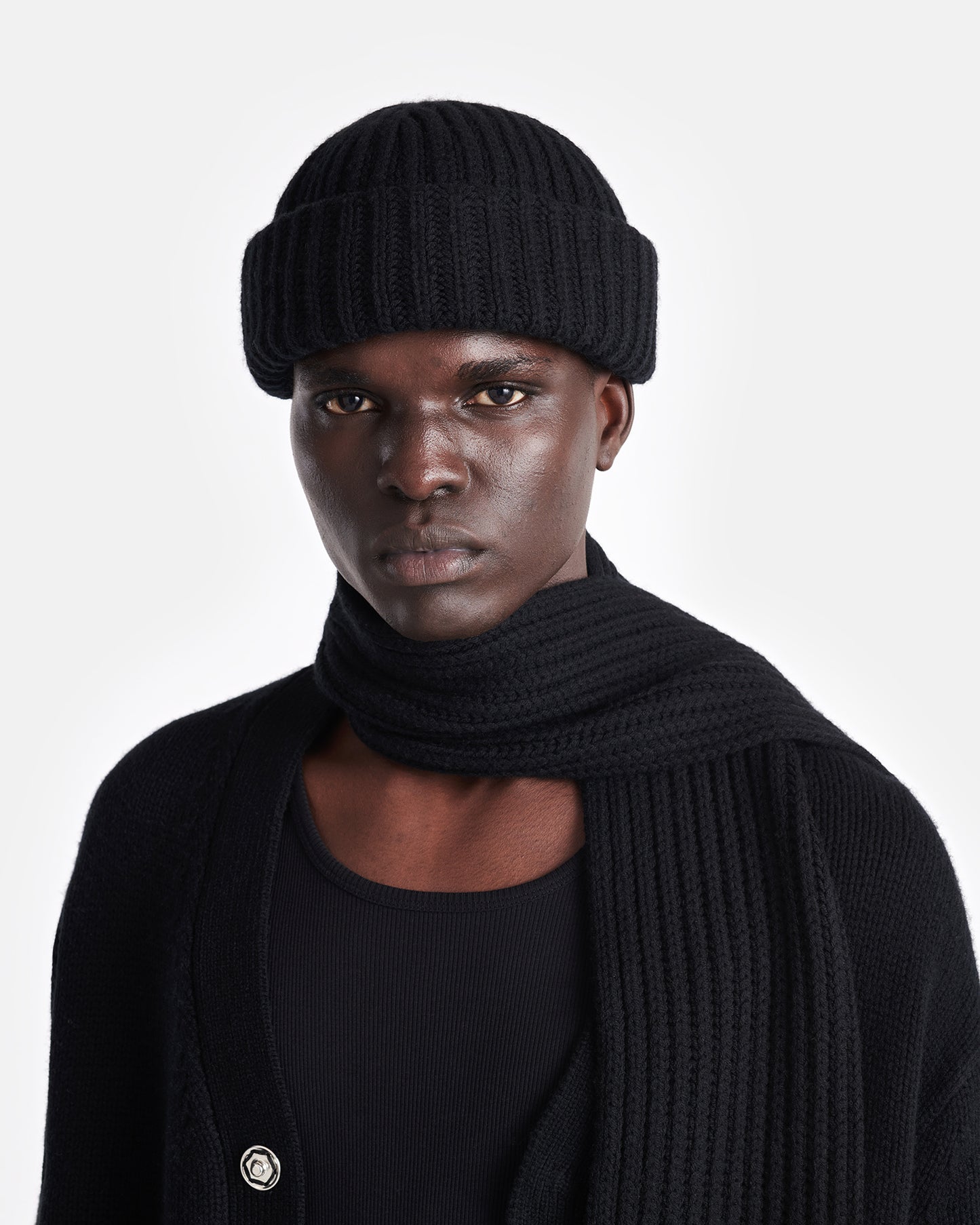 The Ansey beanie is made from a soft cashmere blend in classic black. The wide brim and chunky ribbed finish ensure a cozy, snug fit.