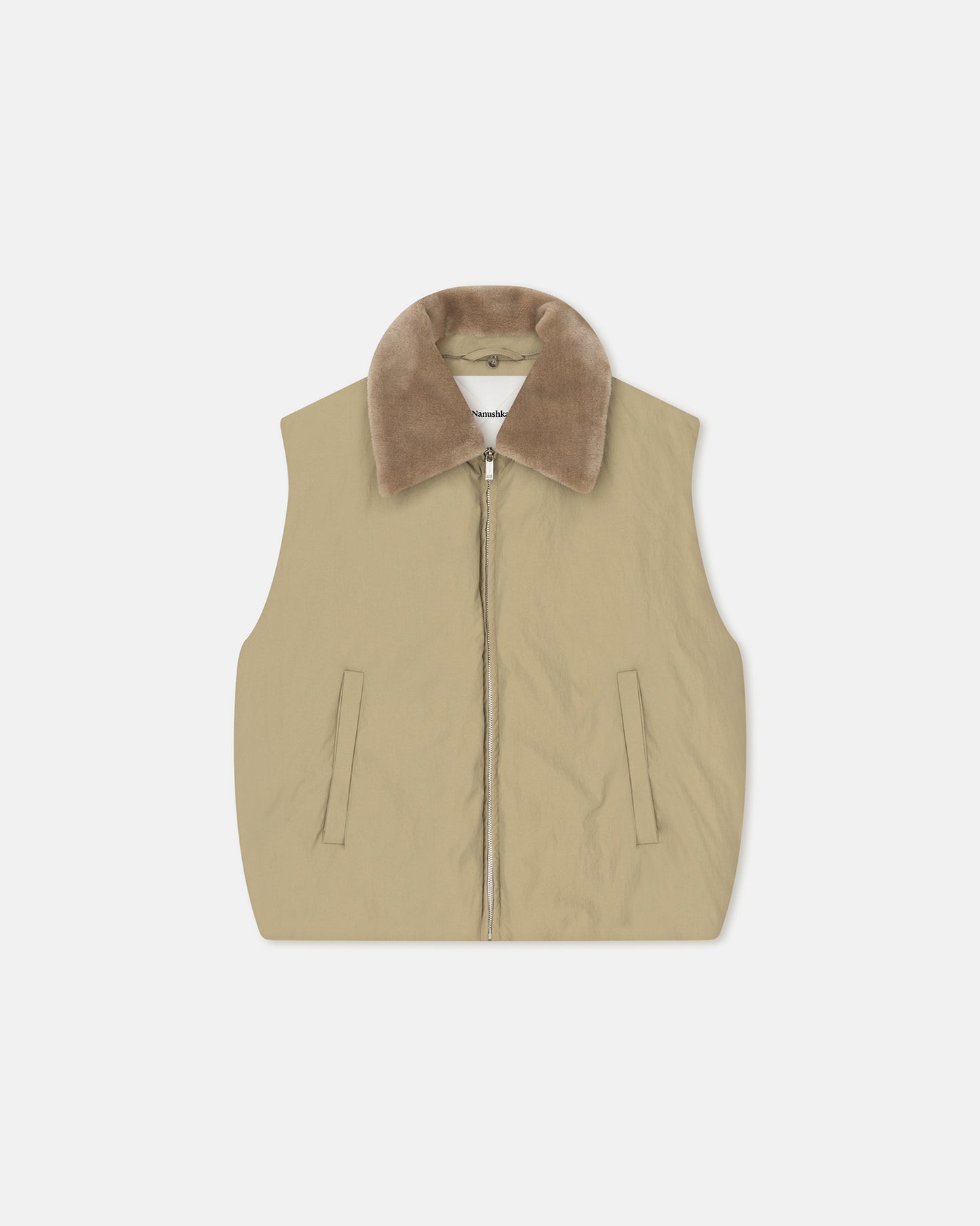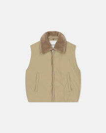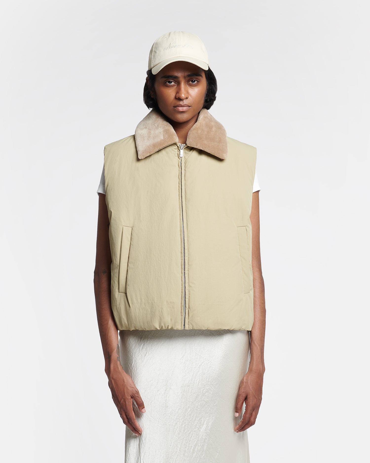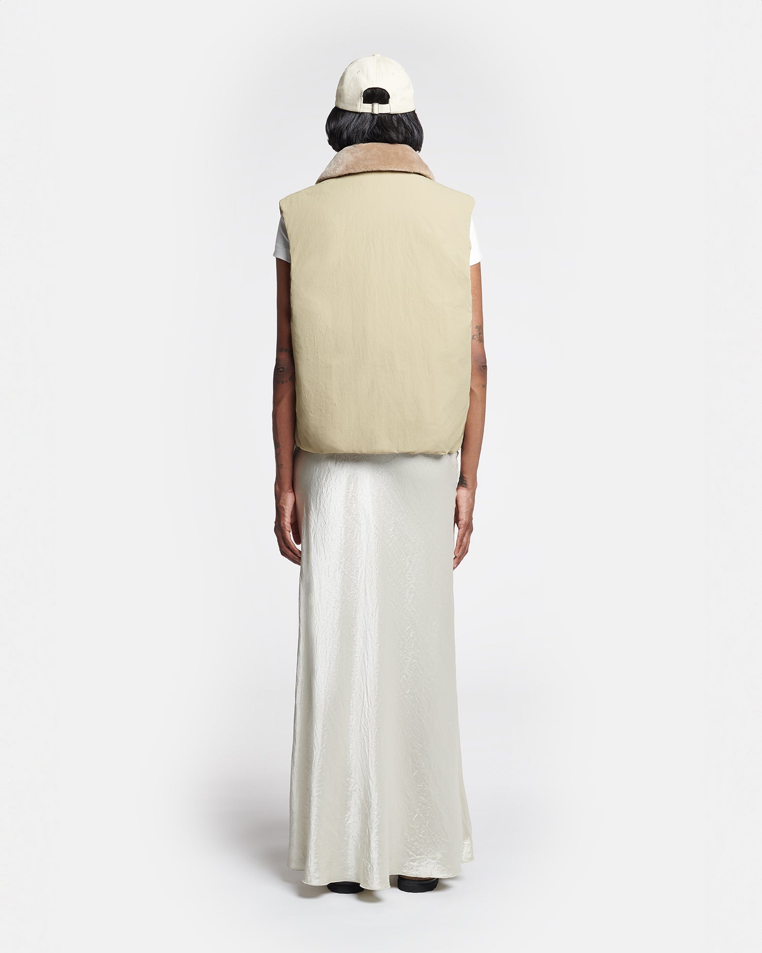 The Mexim vest is made from our utilitarian tech nylon for a boxy fit. Faux-fur trims at the collar are an elegant and modern finishing touch.