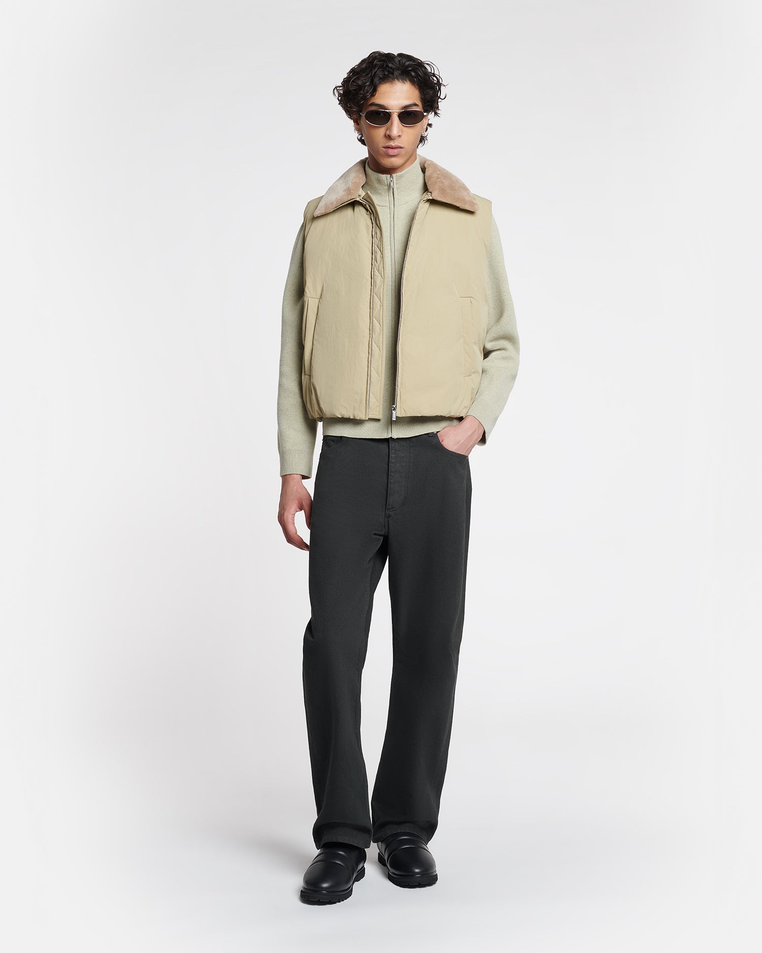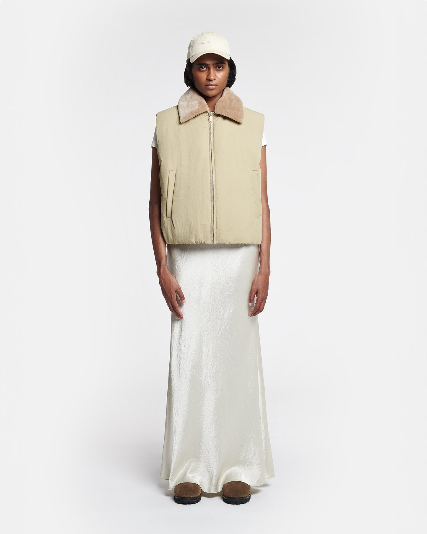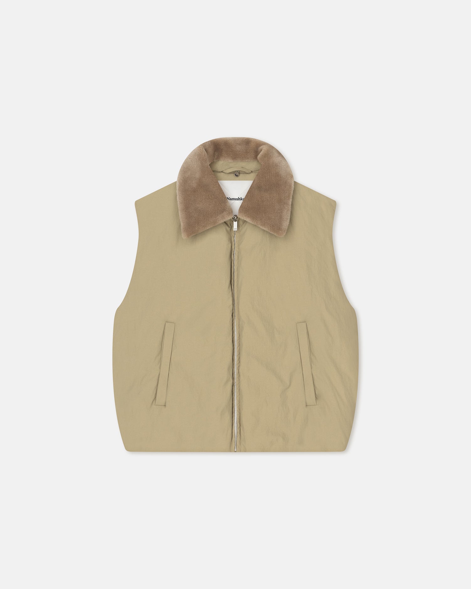The Mexim vest is made from our utilitarian tech nylon for a boxy fit. Faux-fur trims at the collar are an elegant and modern finishing touch.