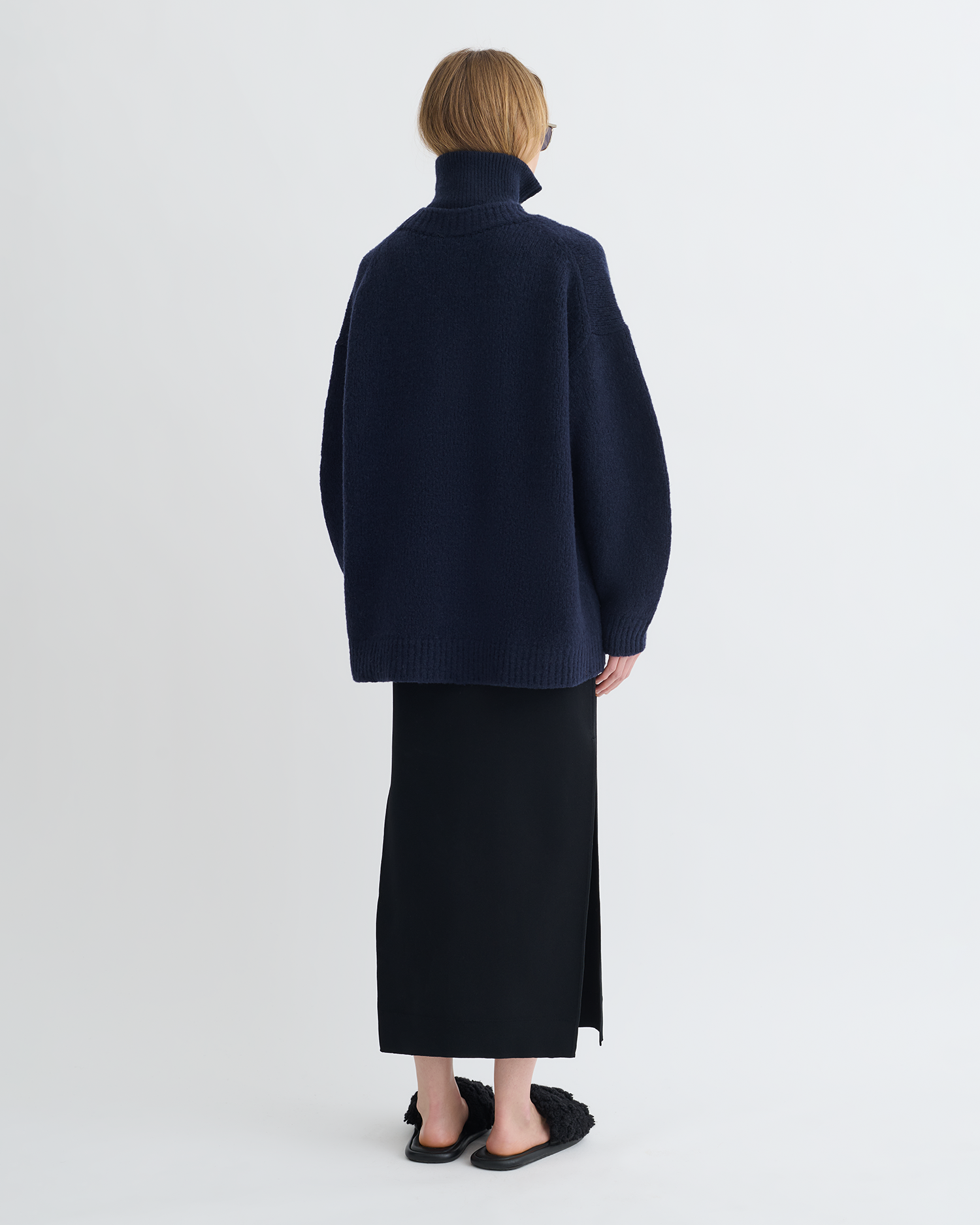 Sports-inspired details juxtapose classic elements throughout our Pre-Fall ’25 collection. The Kylen sweater combines a classic V-neck silhouette with a zip-up turtleneck. It’s made from brushed merino for extra softness.