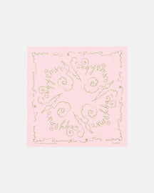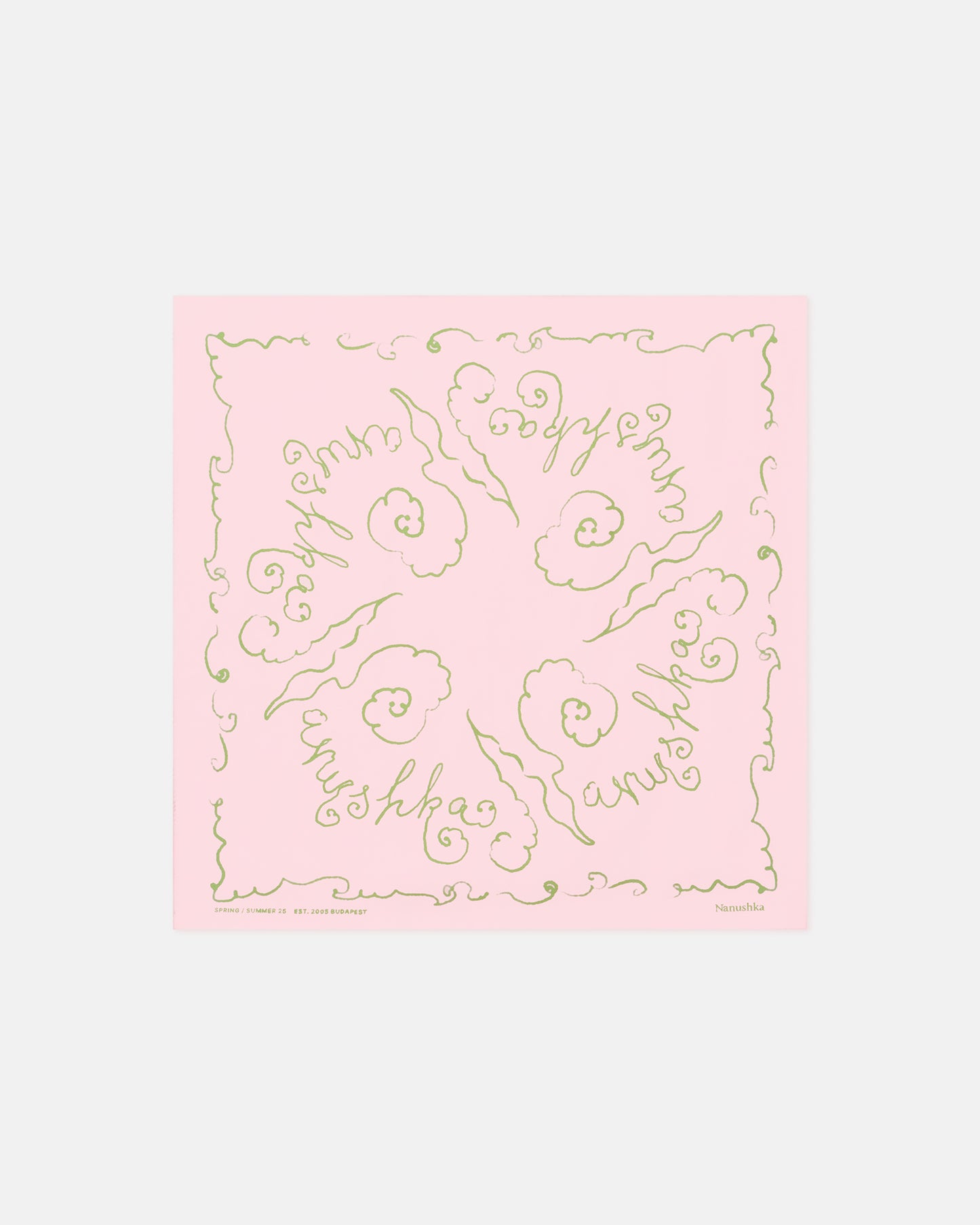 The Shoul scarf is detailed with our logo with swirling letters that draw on cloud forms. Made from silk in a soft pink tone, it can be worn on your head, around your neck, or even looped around the top handle of your bag.