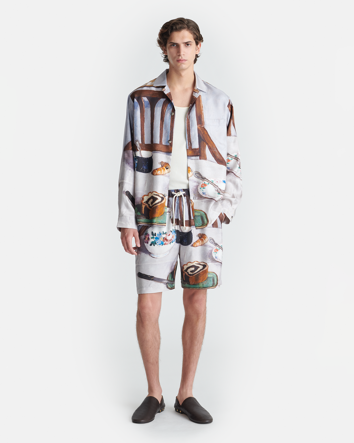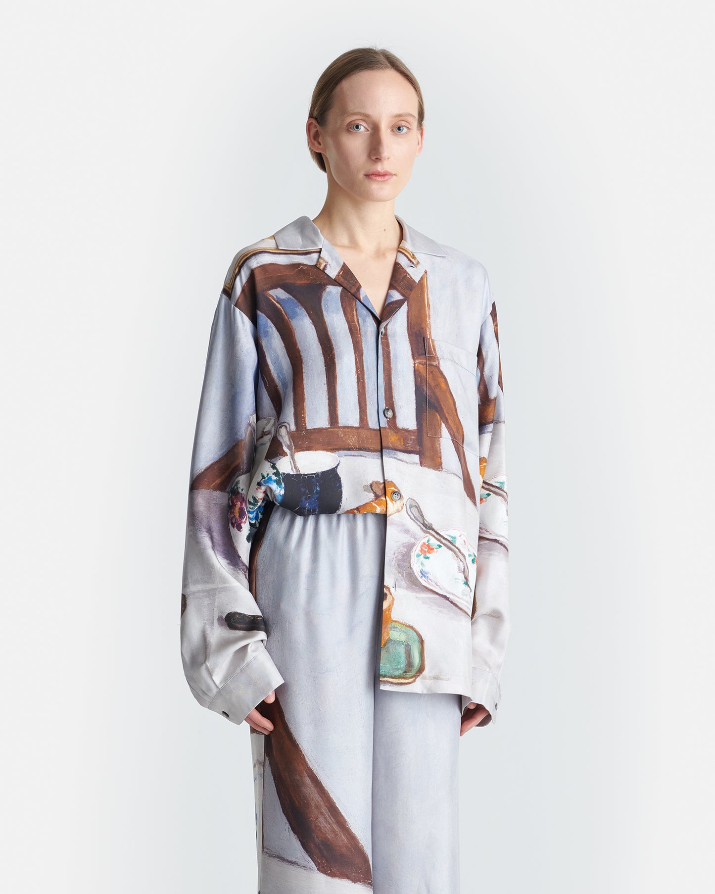 The Caspian shirt is made from silk twill for a loose fit. Simple details like a single chest pocket and button fastenings keep the focus on the print, which features the iconic Poppyseed Cake painting by Hungarian artist Adolf Fényes.