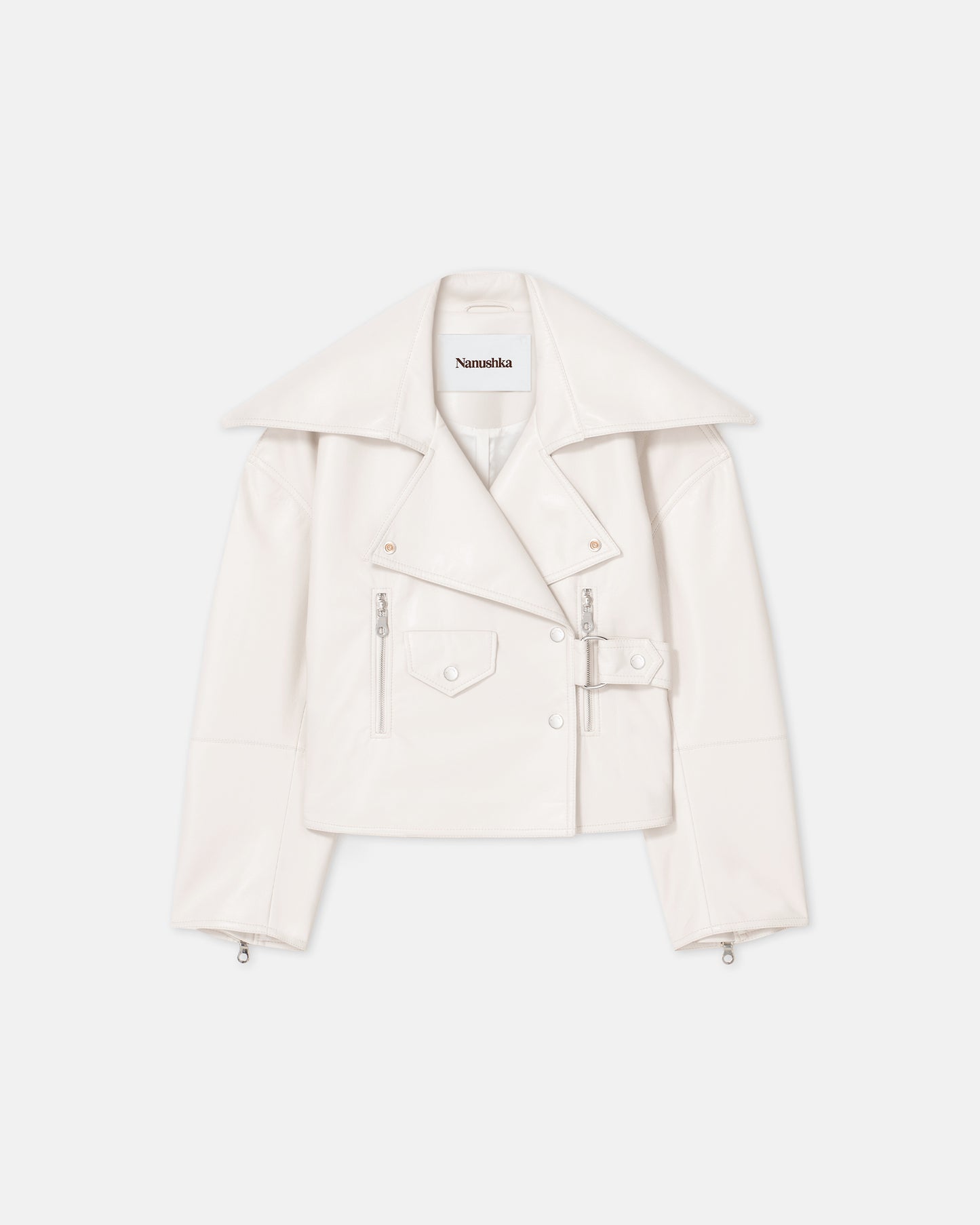 The Ado leather jacket is updated in a fresh crayon hue. It retains its modern biker silhouette and regenerated-leather construction. It’s further distinguished by an exaggerated shawl collar, wide cuffs and a snap-fastening tab at the waist.
