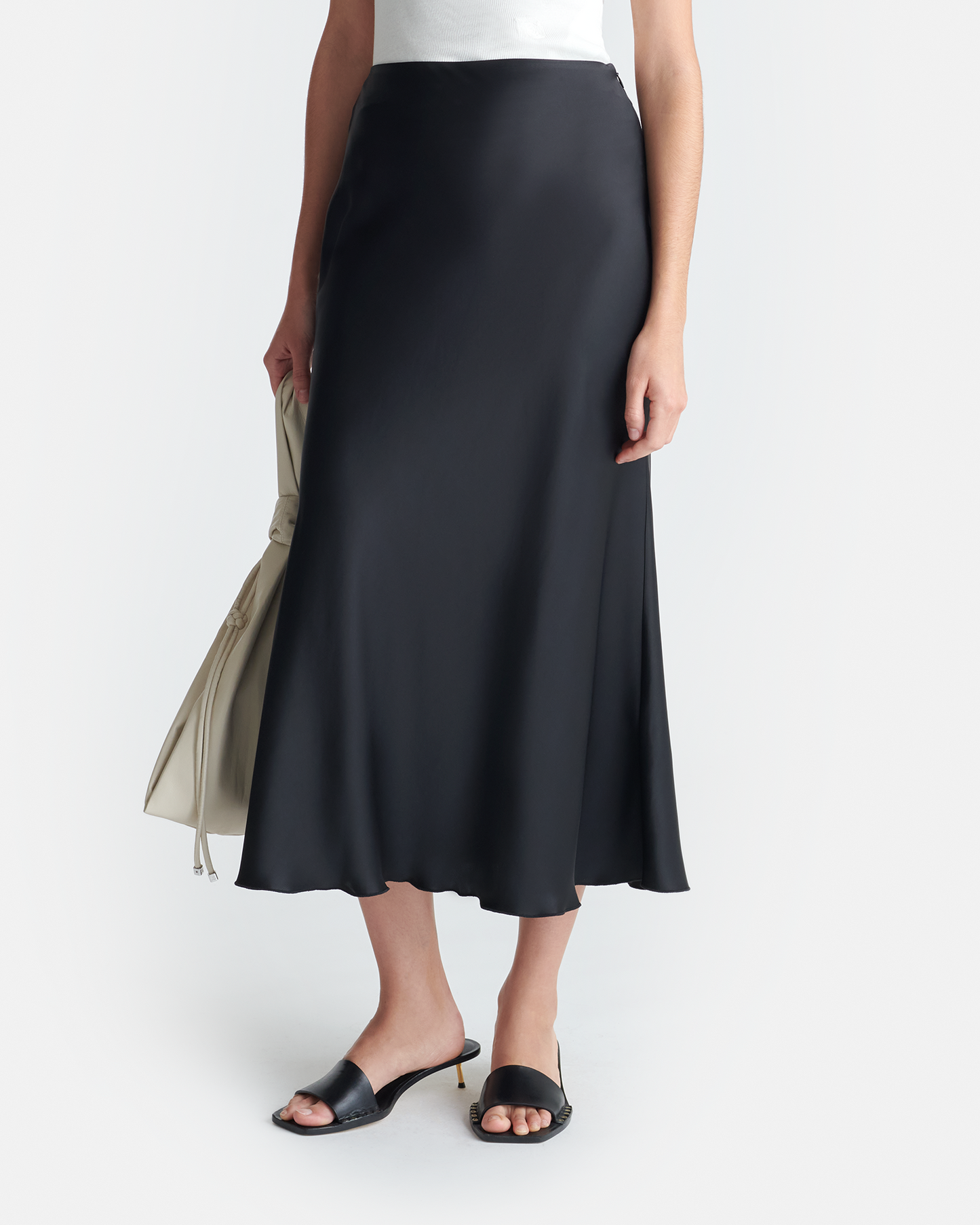 Inspired by classic slip styles, the Razi skirt has a clean-lined, fluid shape. Made from lustrous black slip satin, it sits high on the waist before falling to mid-calf.