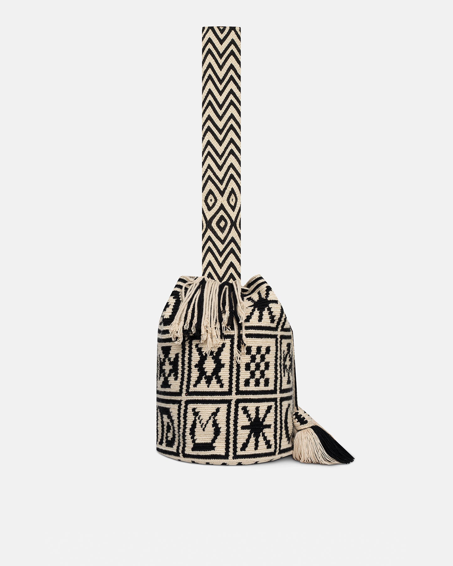 Wayuu Symbol Bucket Bag is crocheted with black and cream diamond Kopjafa motifs to incorporate Nanushka design elements. It has a tasselled drawstring top so you can either expand or contract the shape, and can be held in-hand or swung from one shoulder.