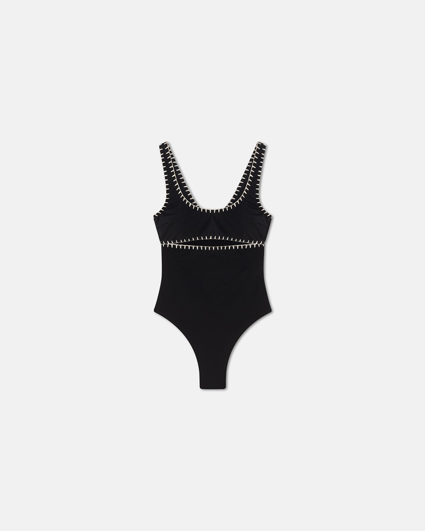 Unmistakably Nanushka, the Sorena swimsuit has a sleek square neckline and cut-out front framed by contrasting creme blanket stitches. It is made from recycled nylon to smooth, sculpt and support your frame.