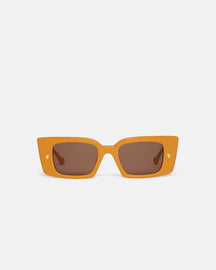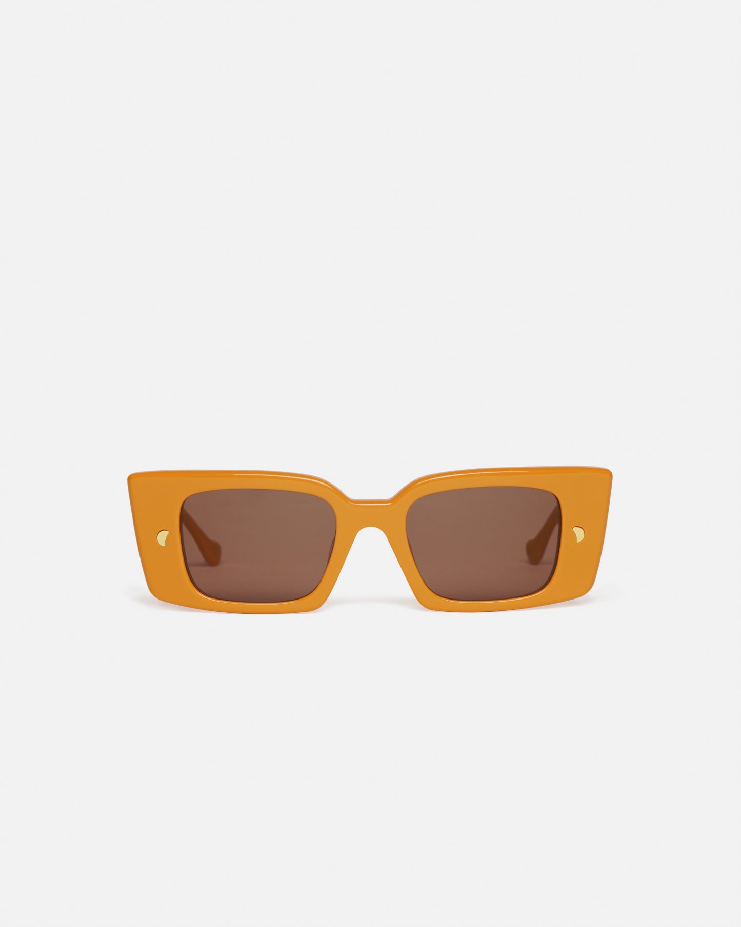 The Carmel sunglasses are defined by bold, rectangular frames. They are made from glossy orange bio-based materials and are detailed with gold-tone hardware at the temples.