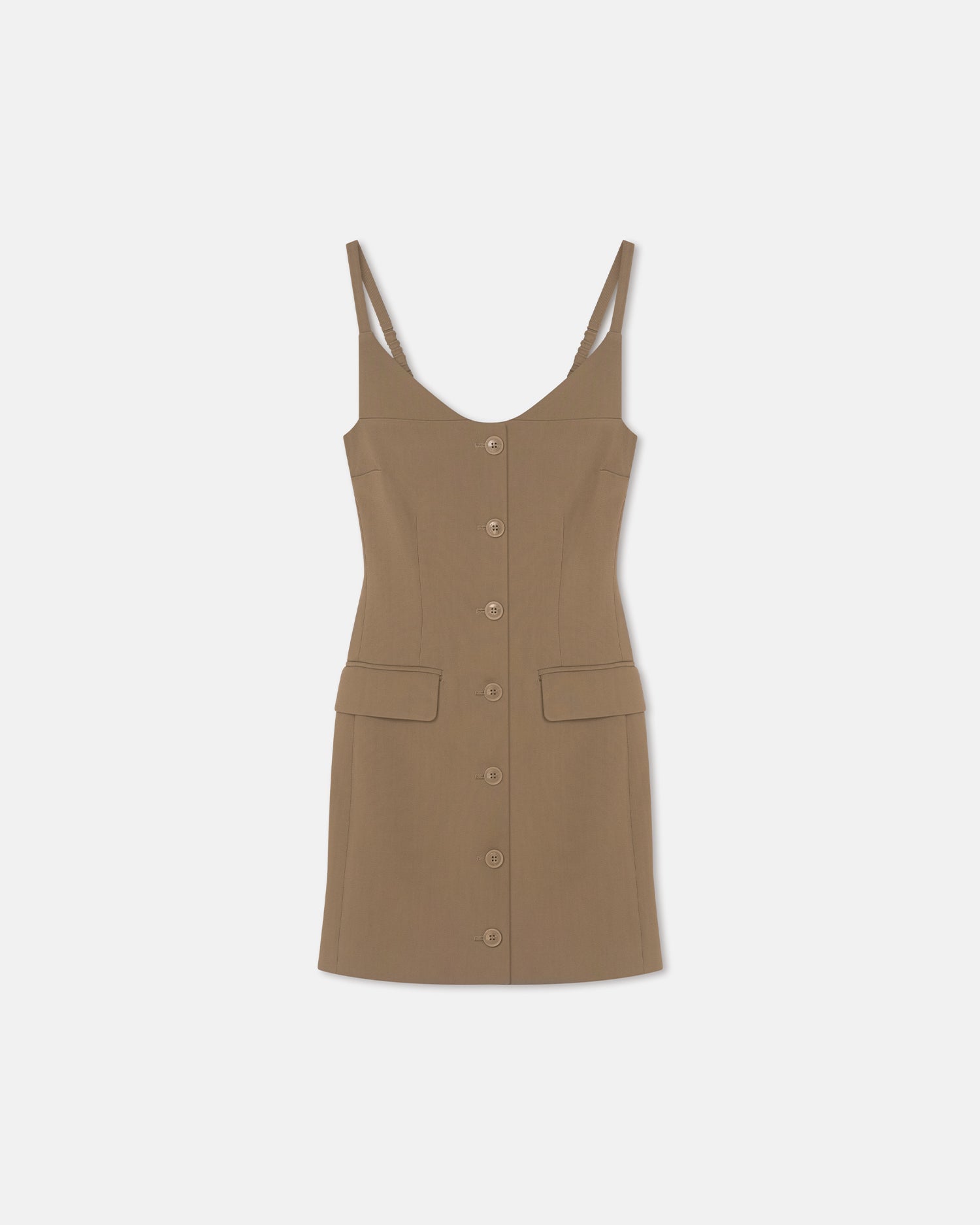Made from a compact suiting fabric, the Peitho dress encapsulates our fresh, unexpected approach to formal wear. It’s modelled on classic tailoring, with a button front and flap pockets, and turns to reveal an open back.