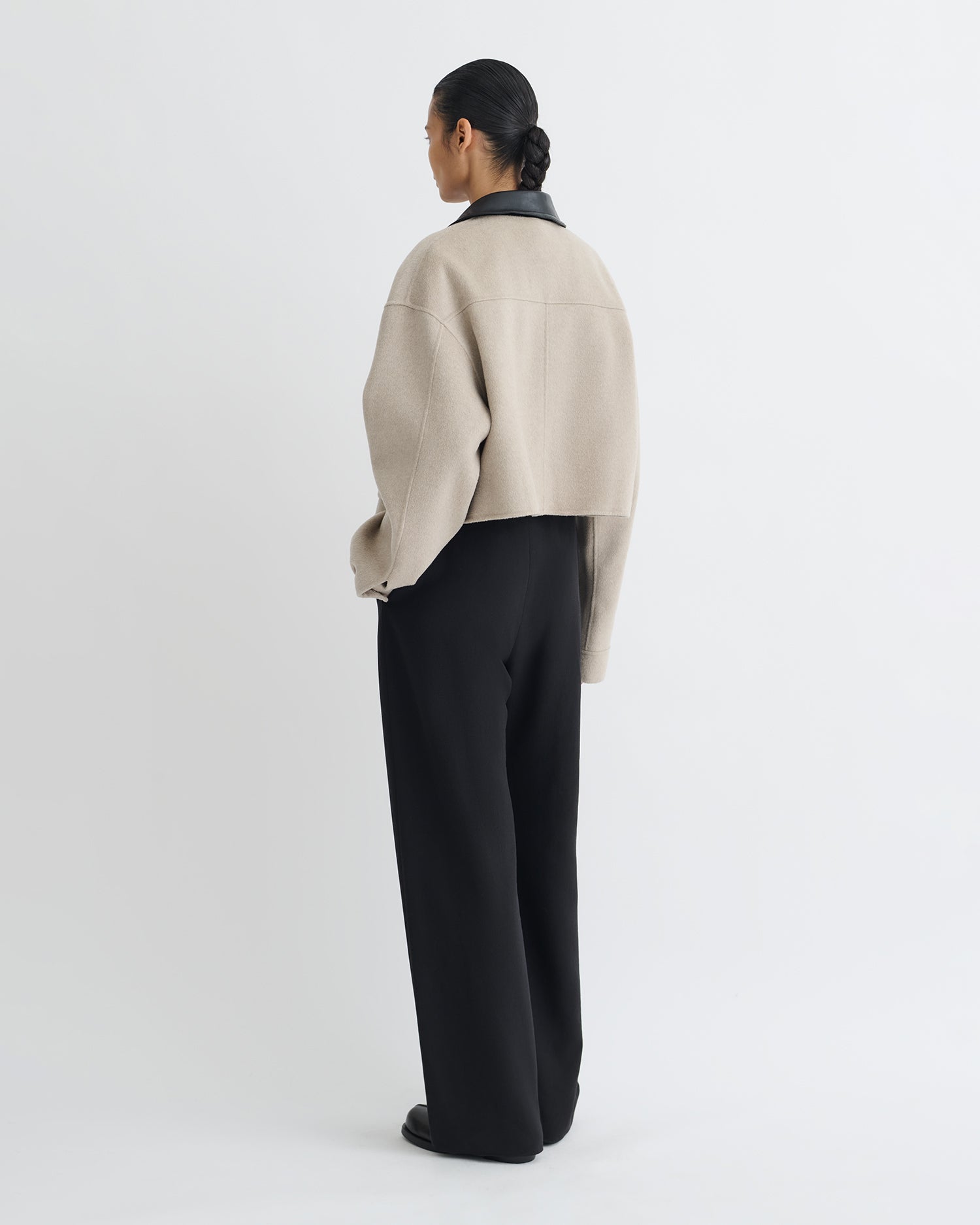 The Phebe jacket is relaxed yet refined. In keeping with our long-held fascination with unexpected fabric combinations, it’s made from stone double wool with a black regenerated leather collar. The fit is cropped with capacious patch pockets.