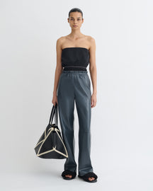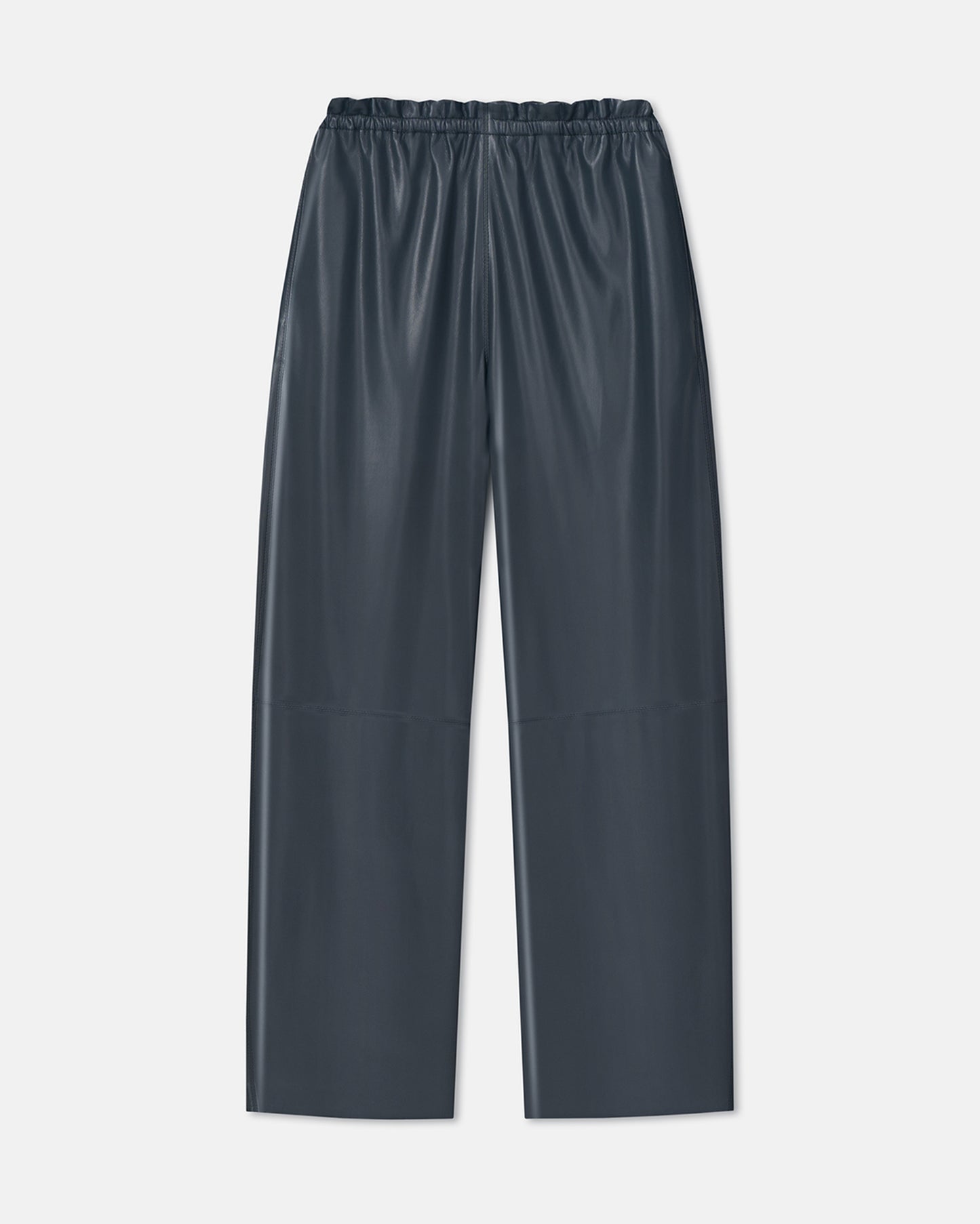 The Geb pants are made from our innovative Okobor™ alt-leather that’s gathered along the high waist. They fall to the floor in relaxed legs and come in a cool steel-blue tone.