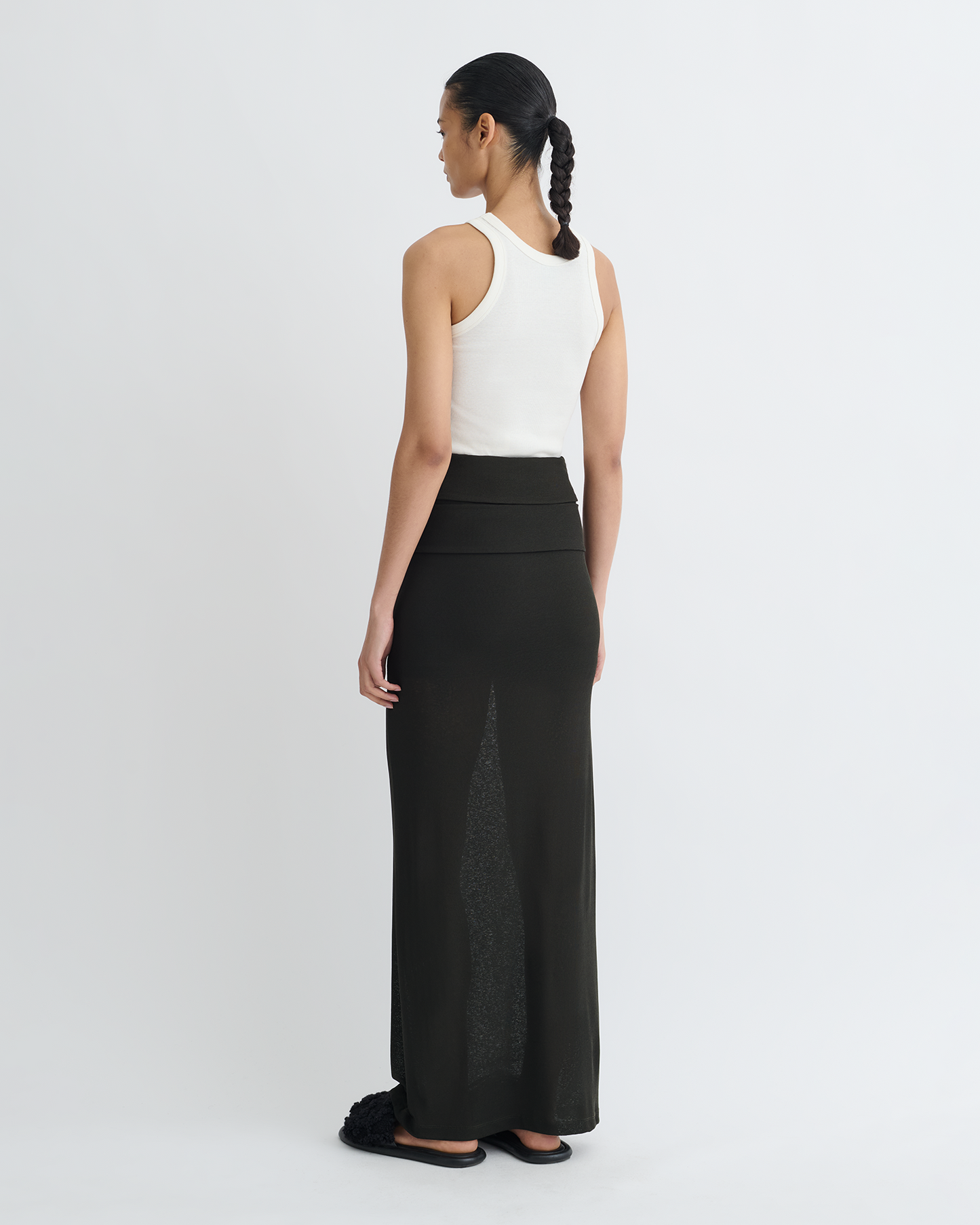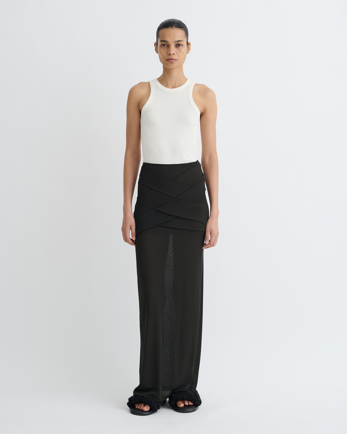 The Shanda skirt is made from soft and lightweight mesh jersey with a crisscross of draping at the waist. The maxi length is effortless and elegant.