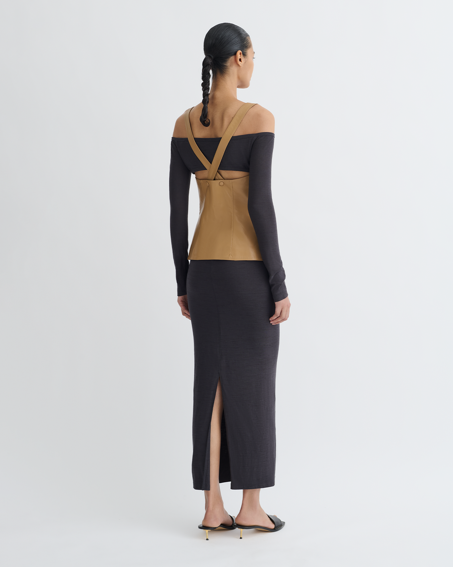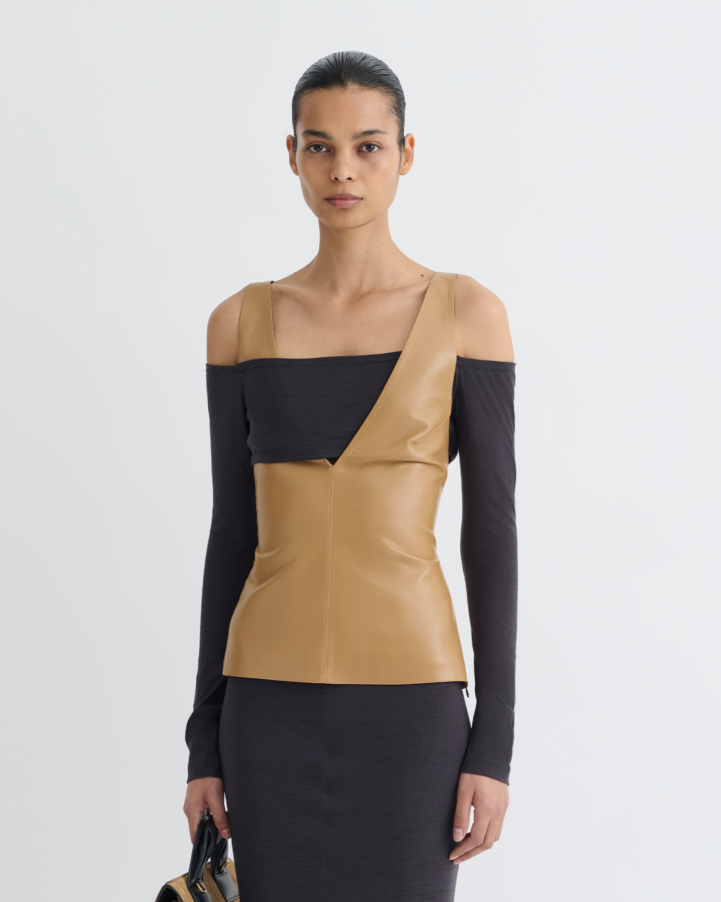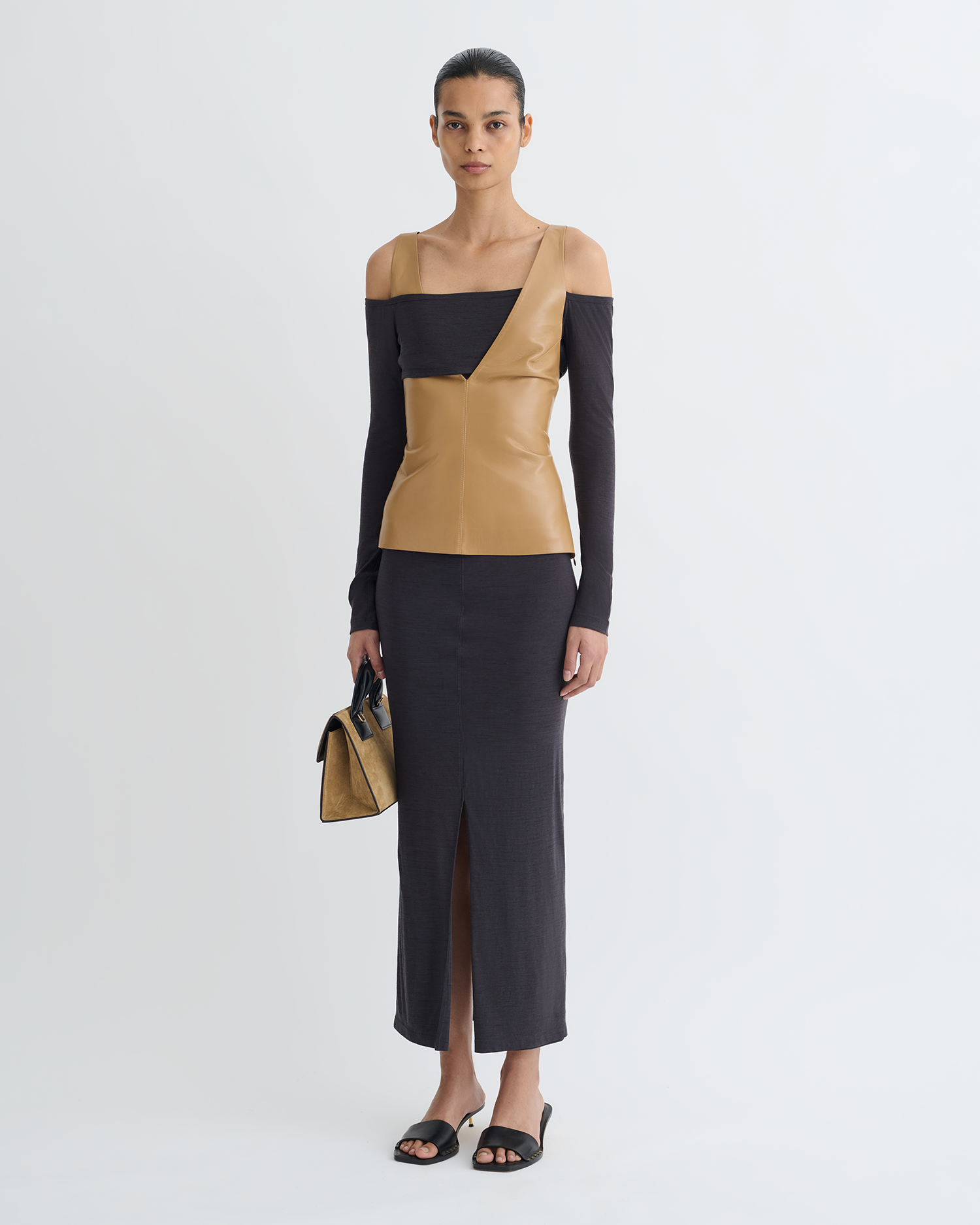 The Ferr top juxtaposes fitted oak Okobor™ alt-leather with delicate grey wool jersey – fabric blocking is a signature Nanushka technique prized for its balance of ease and elegance.