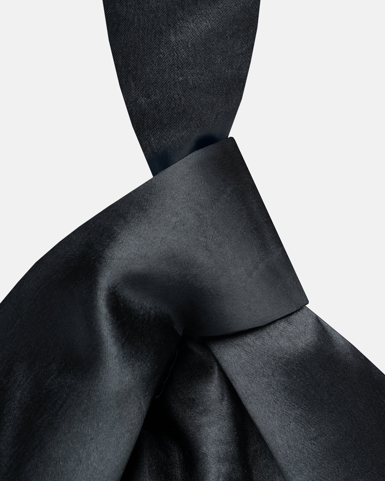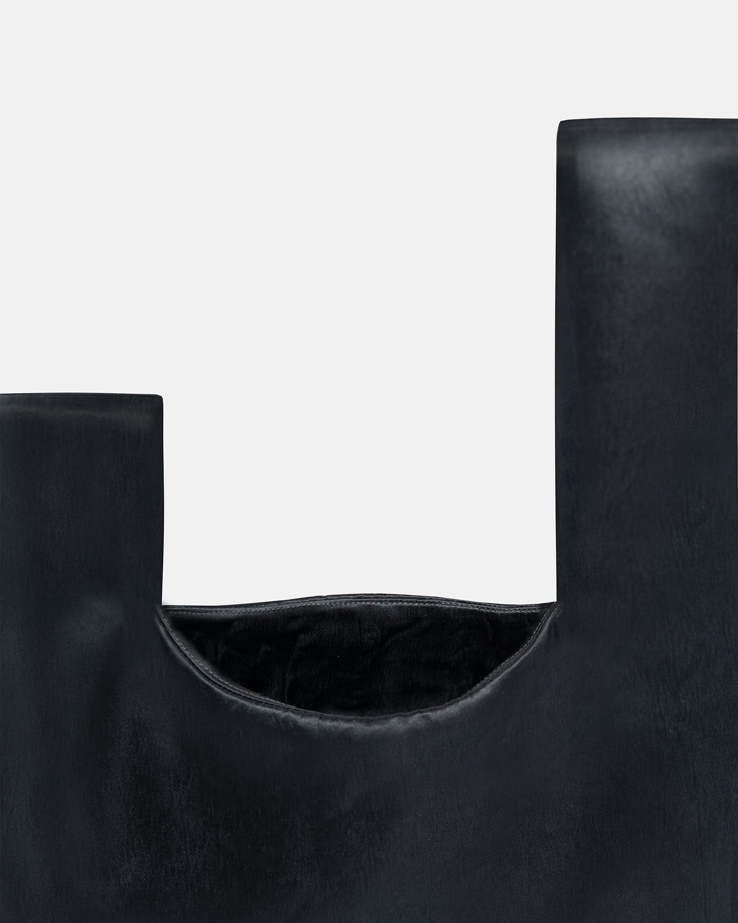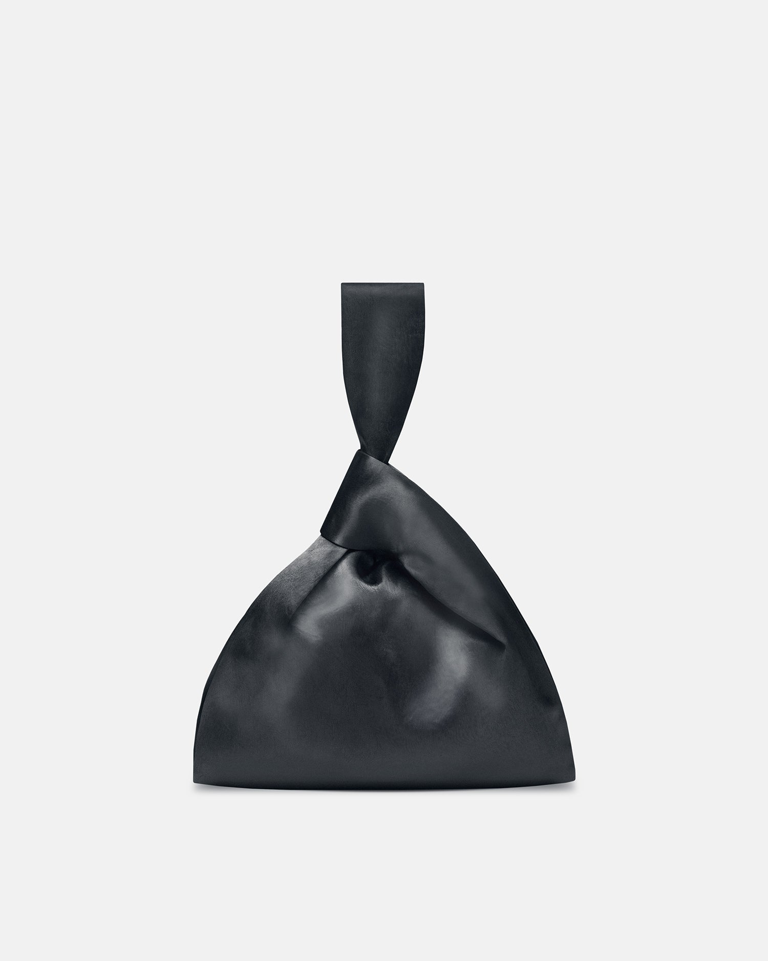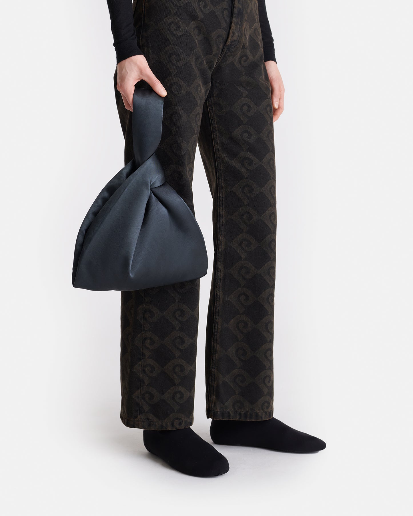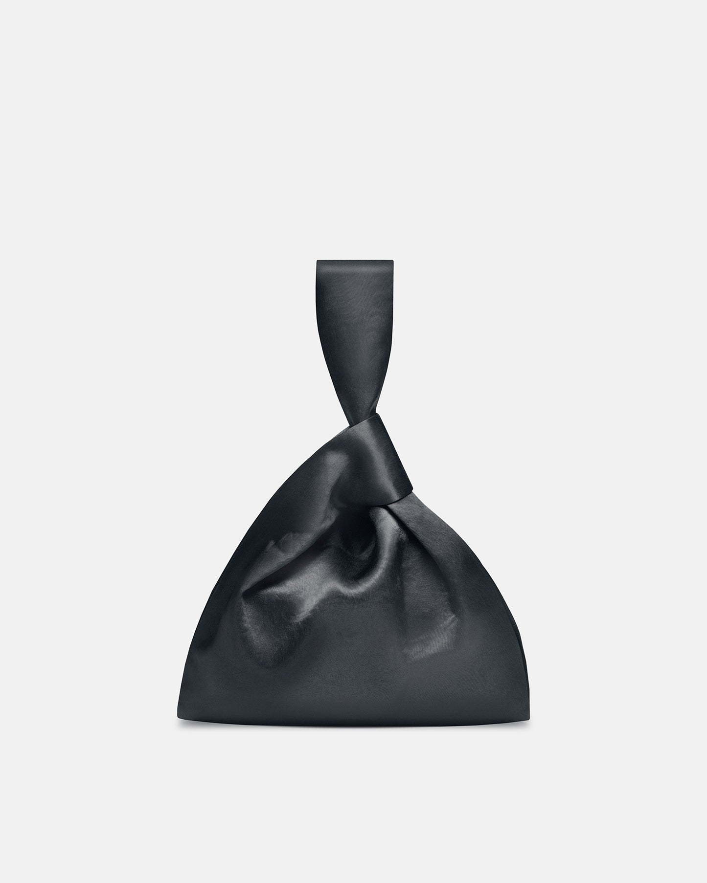 The Jen bag is made from crinkled satin in a classic carbon tone. The slouchy triangular shape has a looped wrist strap for practicality.