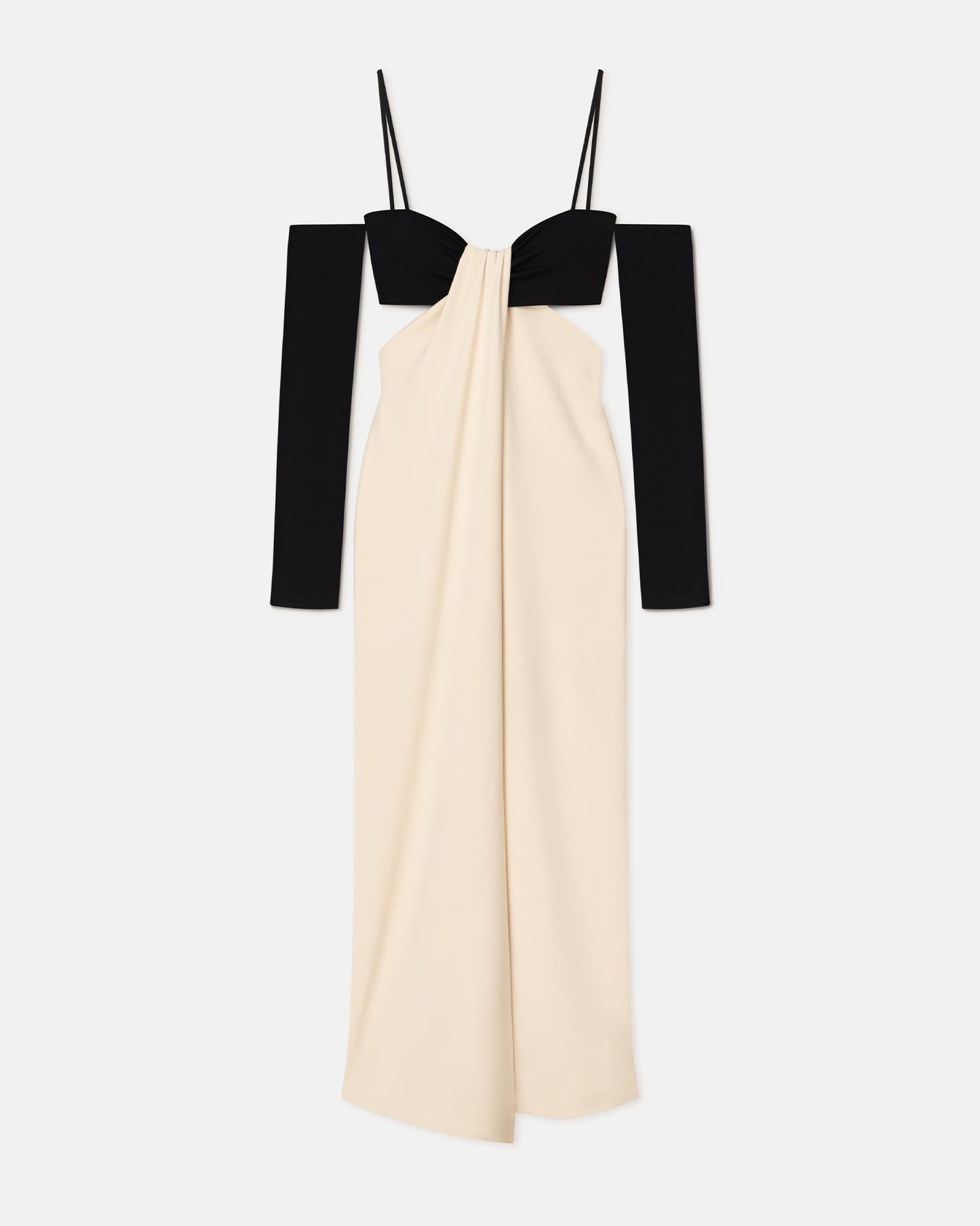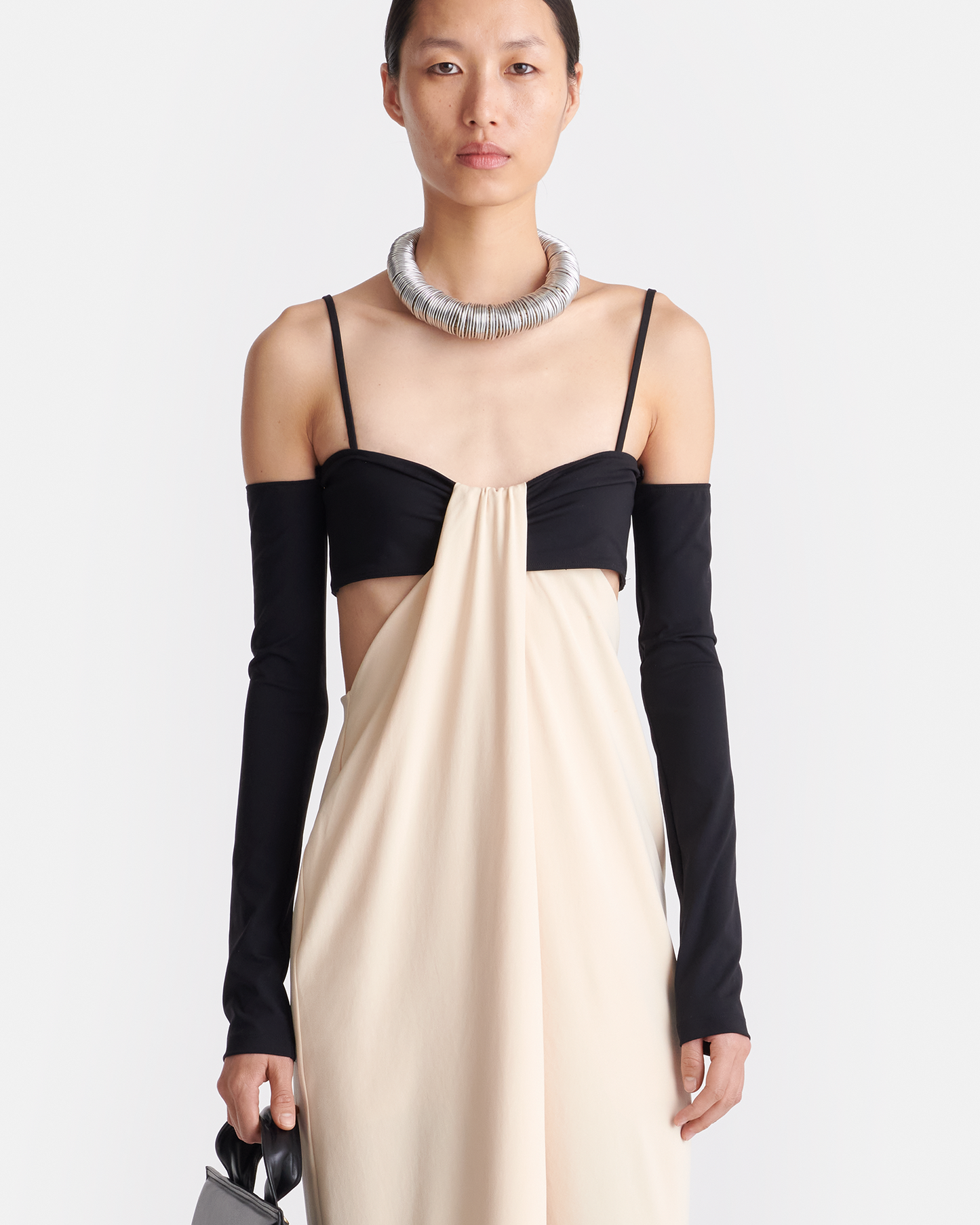 Draped silhouettes are a key Nanushka design element, exploring our favourite contrast of statement-making and refined. The Selly dress is made up of a black jersey bralette and off-the-shoulder sleeves with a draped butter-coloured georgette skirt that falls to the ankles.