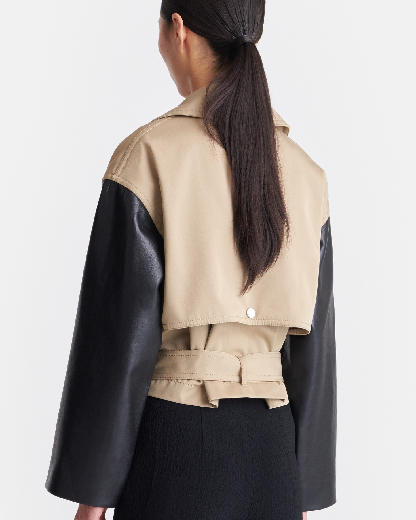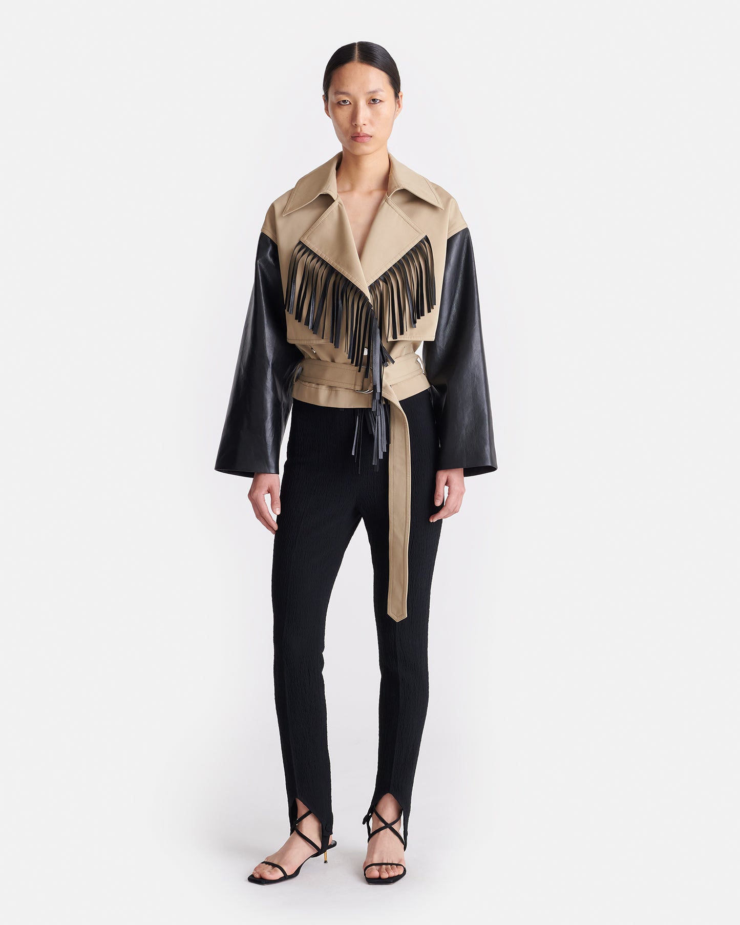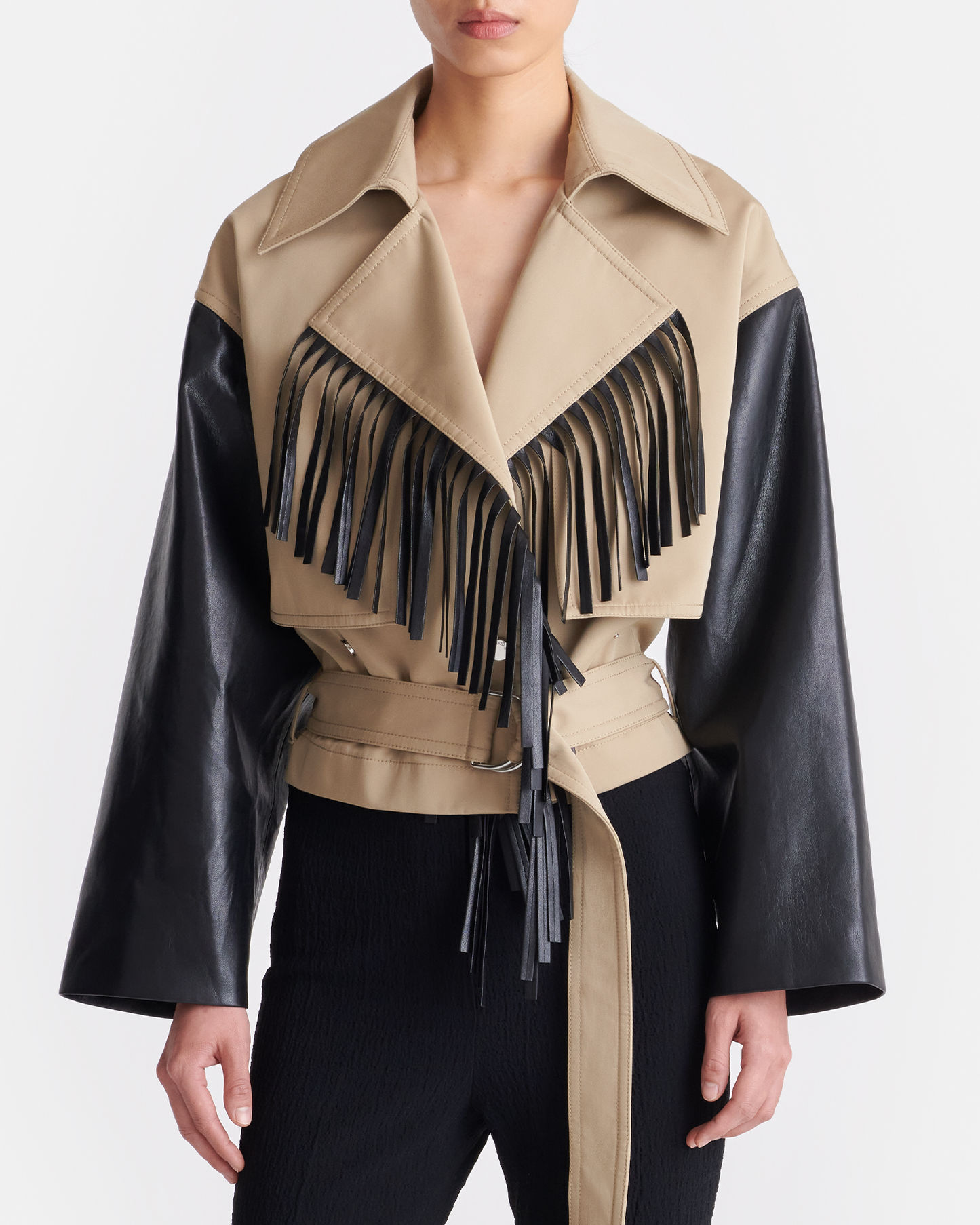 The Kazia jacket is modelled on classic trench styles, but has contrasting regenerated leather sleeves and a wave of fringing for a cool, contemporary feel. The cut is cropped with a waist-cinching belt.