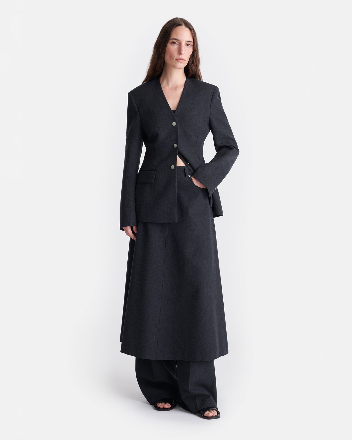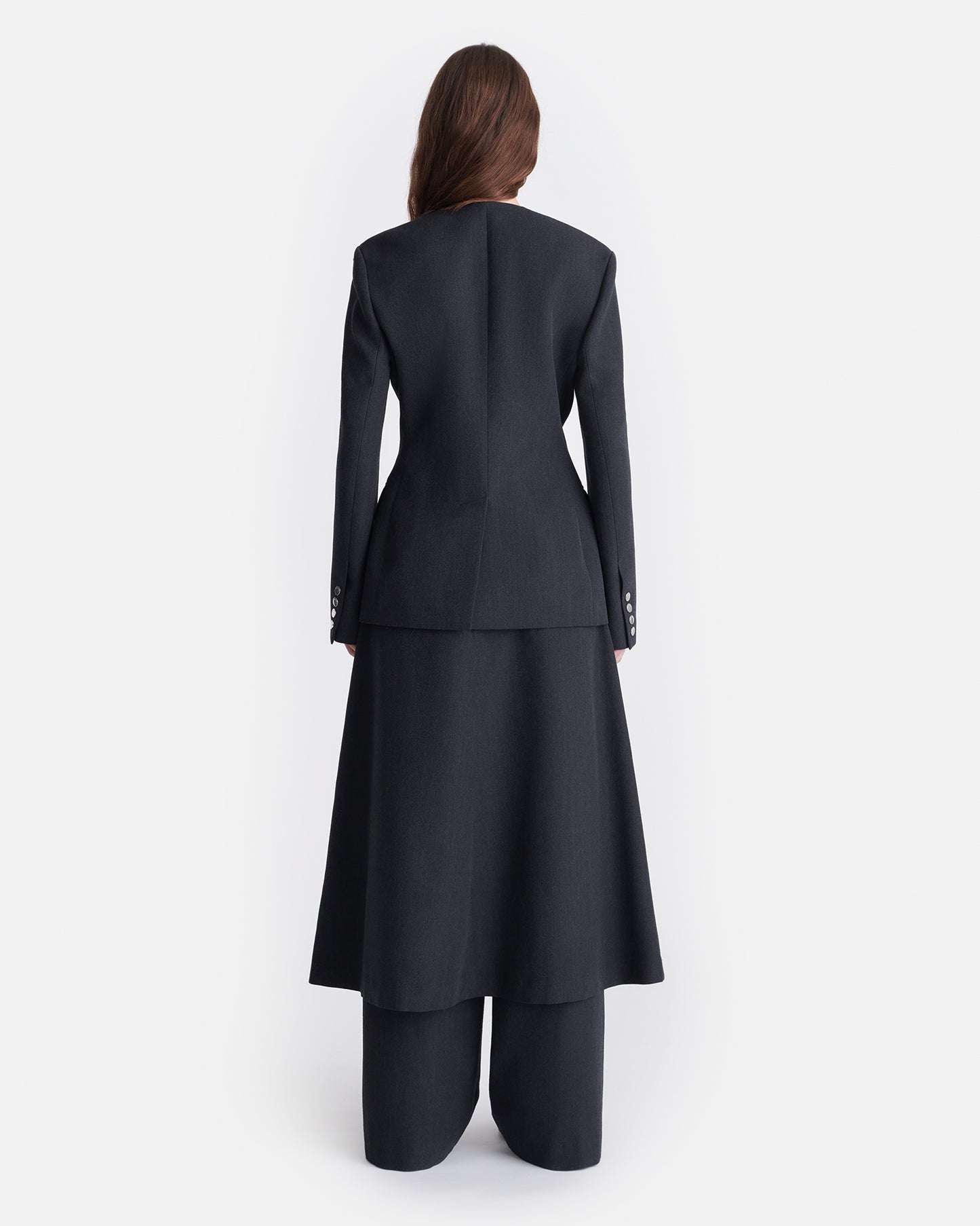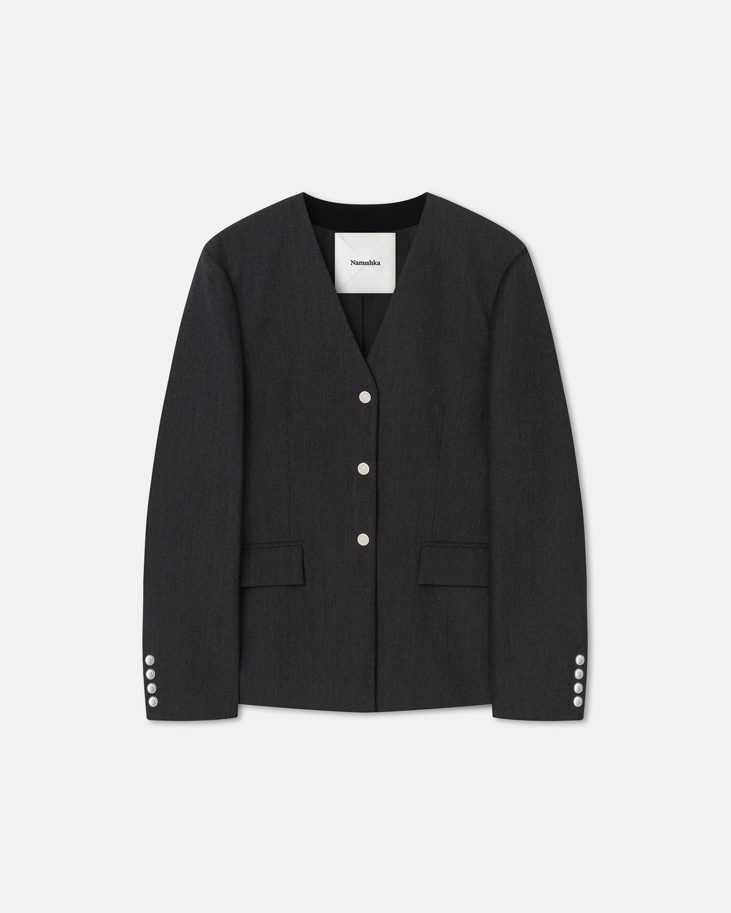The Lenke jacket is expertly tailored from wool twill in timeless grey melange. It has classically tailored features – a darted waist, single-breasted silhouette, flap pockets – but feels fresh and contemporary thanks to the collarless design.