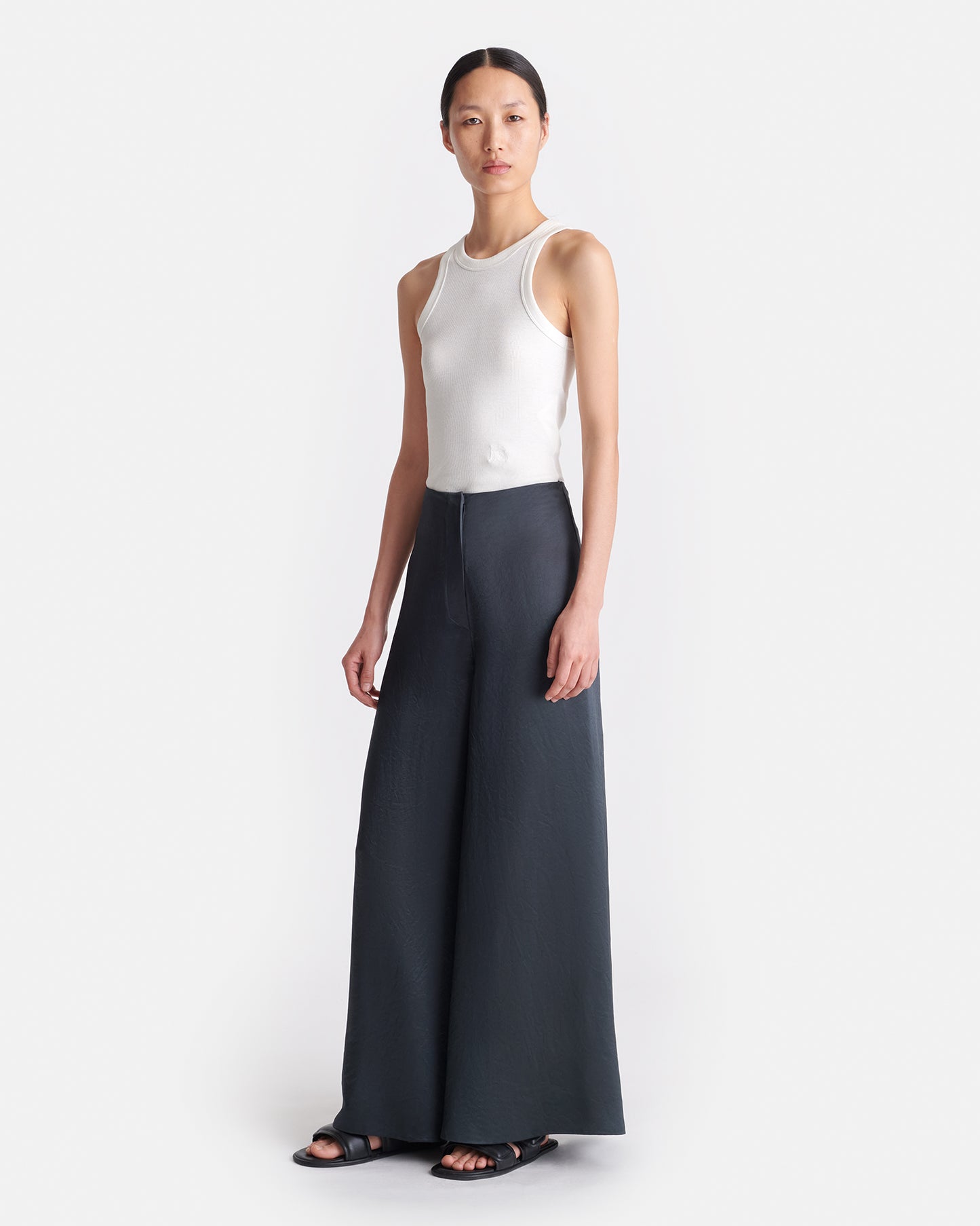 The Zaniah pants have a voluminous wide-leg silhouette. They’re expertly tailored from our signature slip satin and come in a timeless carbon hue.