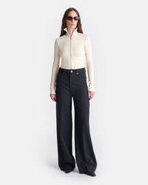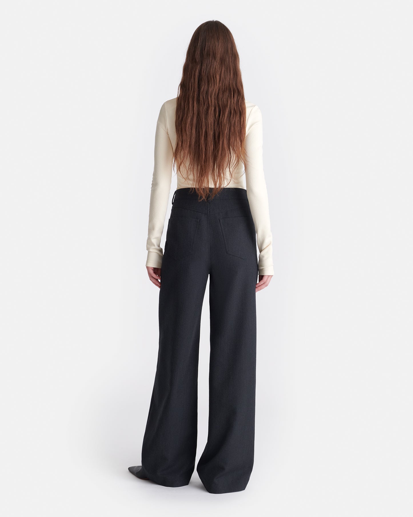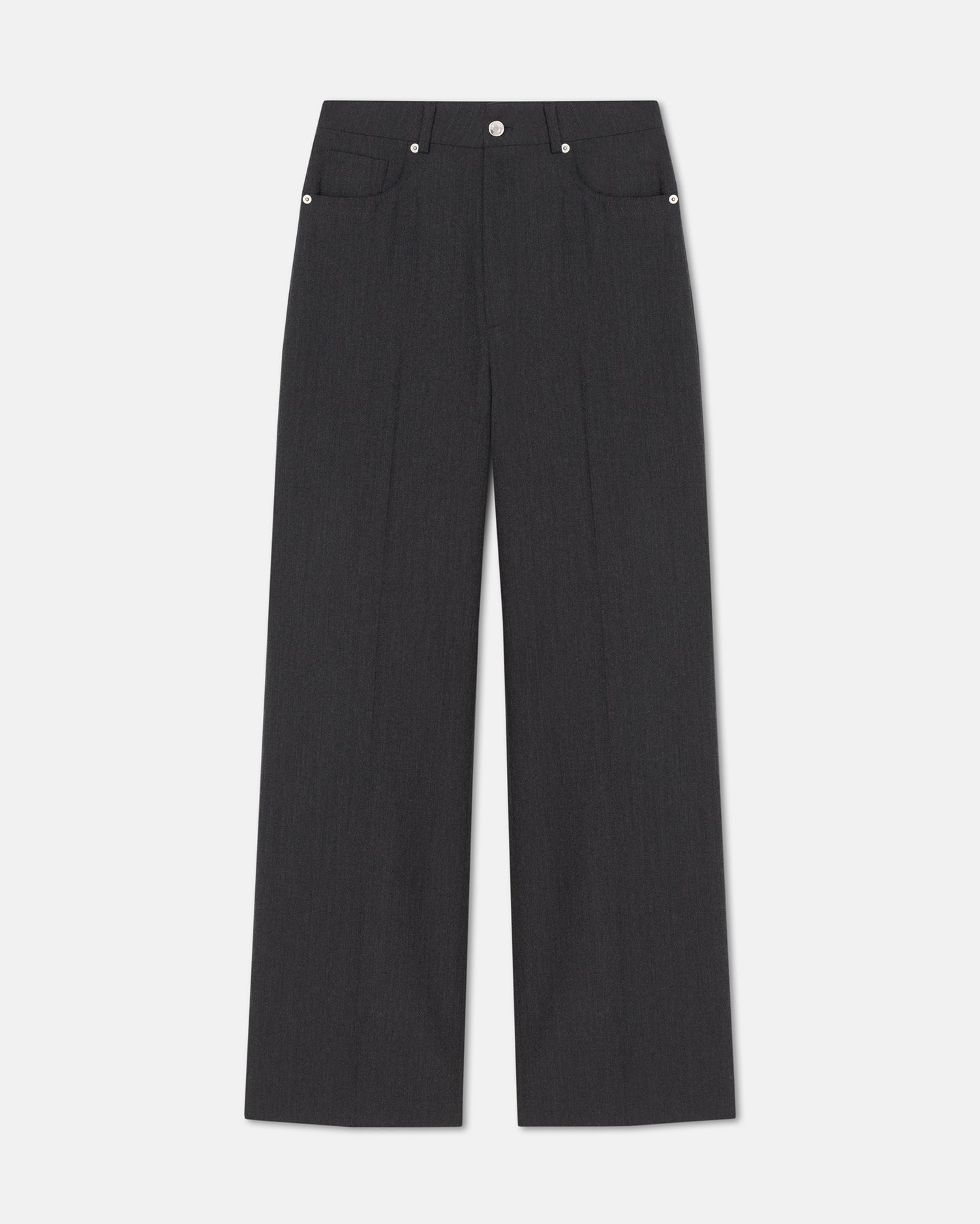 The Korina pants are made from timeless grey melange wool twill and have a high-rise waist and sharp pleats to enhance the wide legs. Wear yours with the coordinating blazer and a fitted cropped top for a minimalist aesthetic.