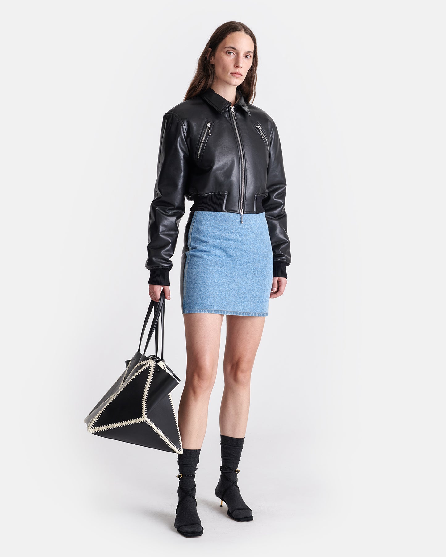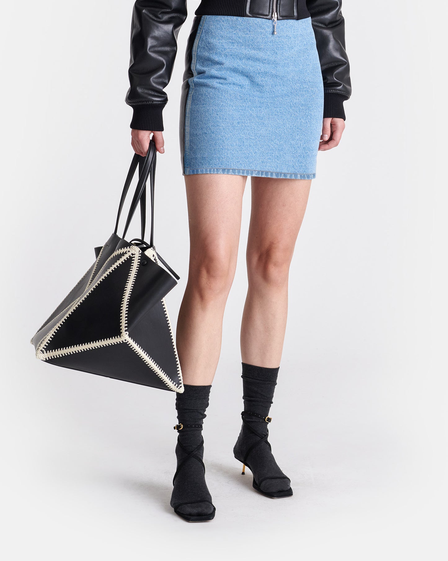 Denim And Regenerated Leather Mini Skirt