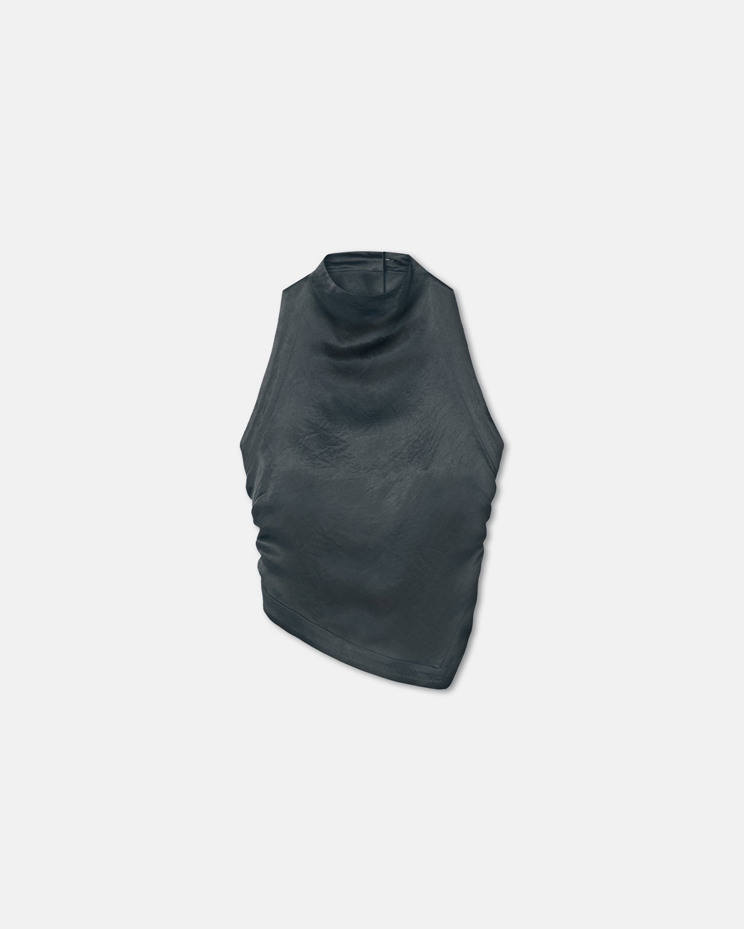 The Inara top is so easy to style. Made from crinkled satin, it fits closely through the body from a halter neckline and comes in a carbon hue.