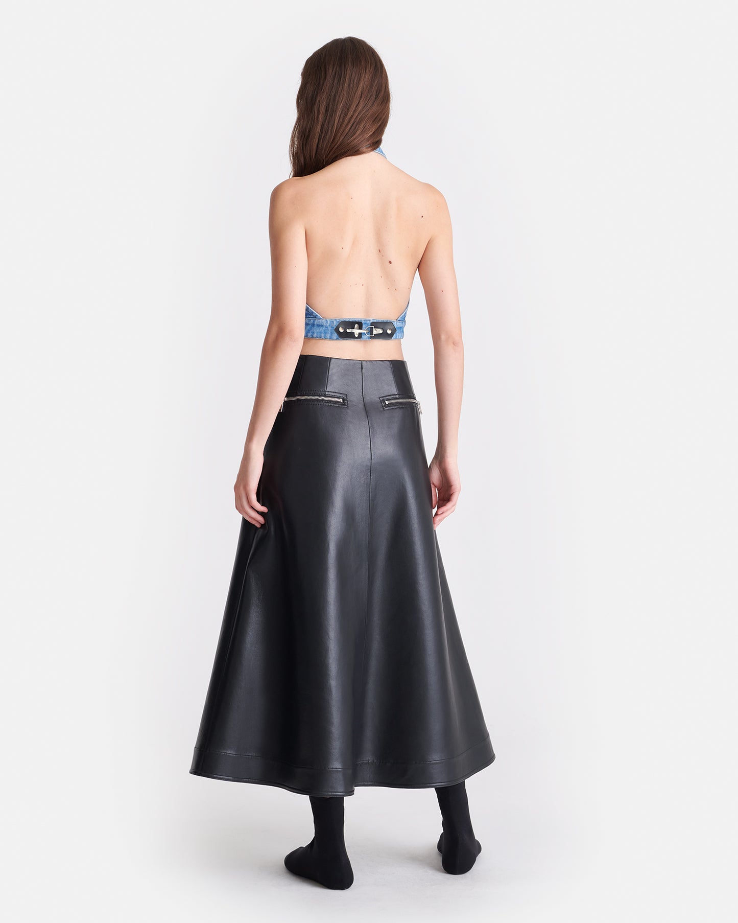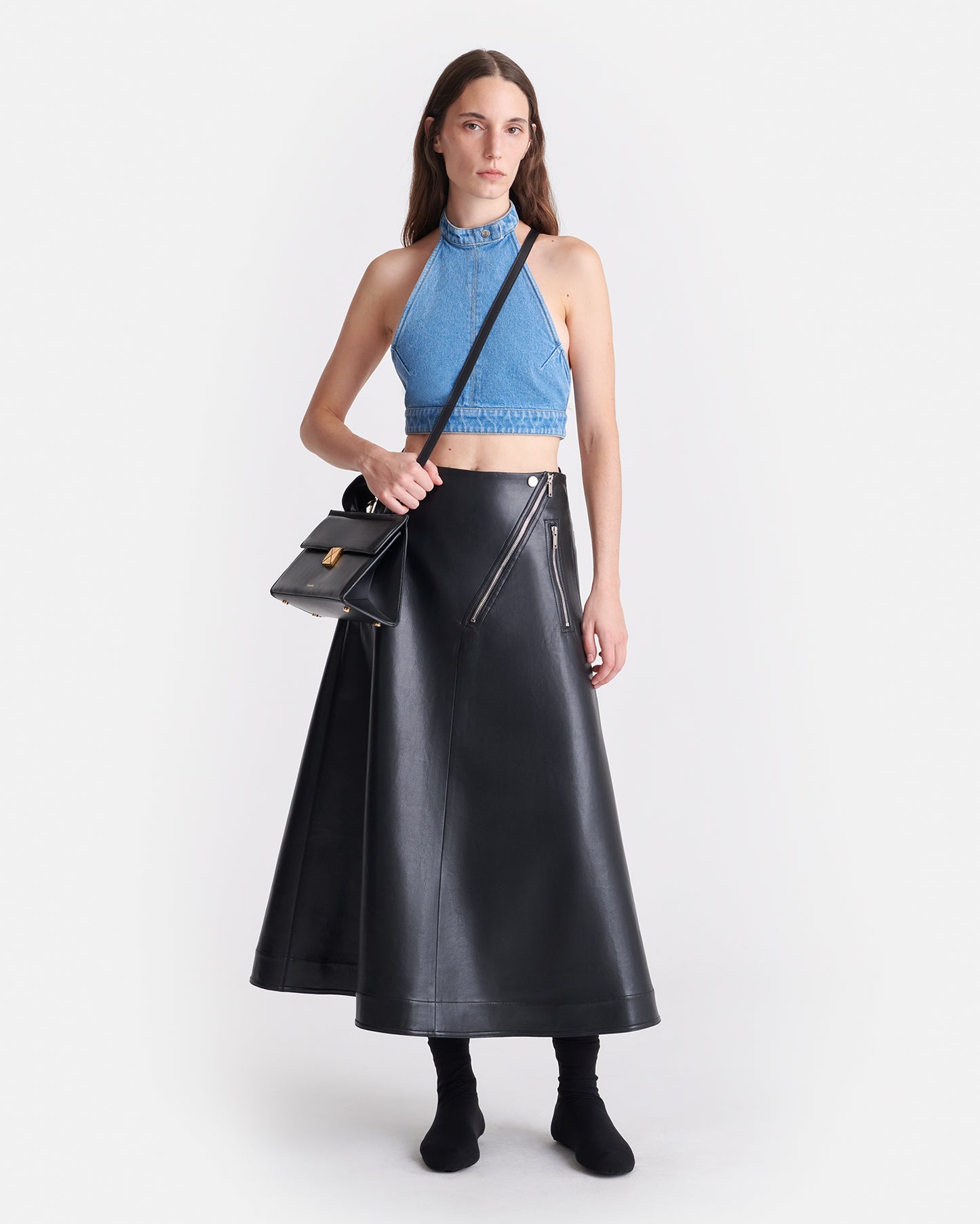 The Arina top has an easy 80s Grunge feel. Made from denim, it has a halterneck silhouette outlined by Biker-inspired hardware.