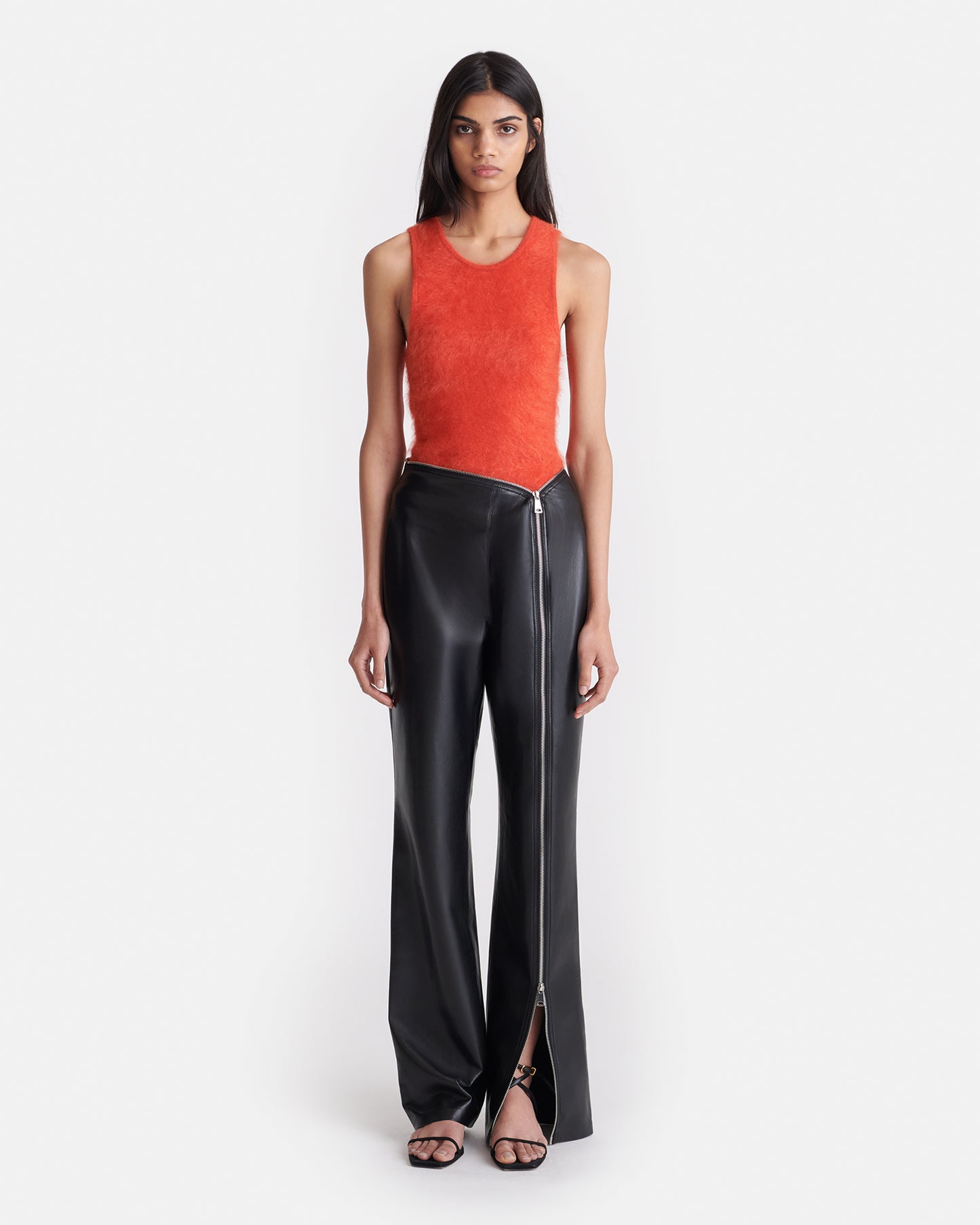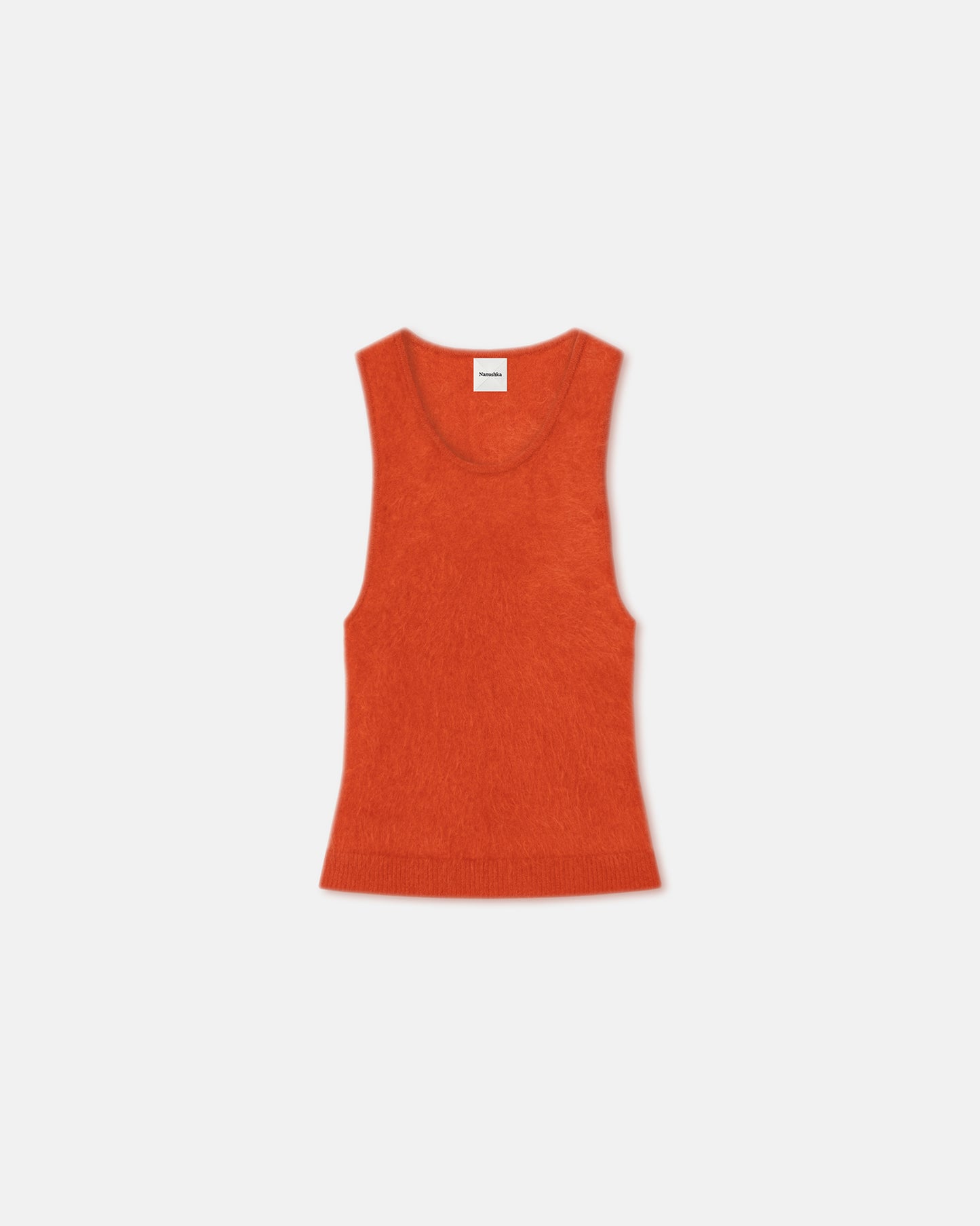 The Bianka vest is knitted from cashmere that has been brushed, so it’s super soft and warm. The red tone is equal parts muted and vivid.