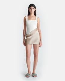 Innovative fabric stories are a Nanushka signature. The Marijn dress comprises a creme ribbed-jersey body and dune-toned slip satin skirt – the asymmetric foldover waist is super flattering.