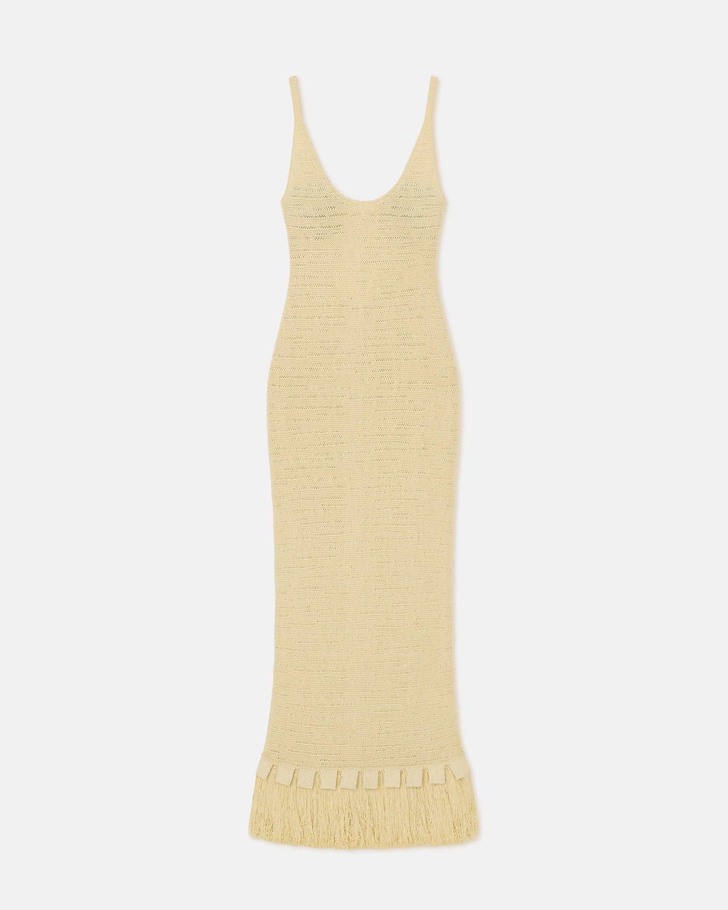 We celebrate nomadic texture and tactility for Spring/ Summer 2025. The Alona dress is knitted from a soft cotton blend for a close fit through the body and finished with a fringed hem – it swishes beautifully with every step.
