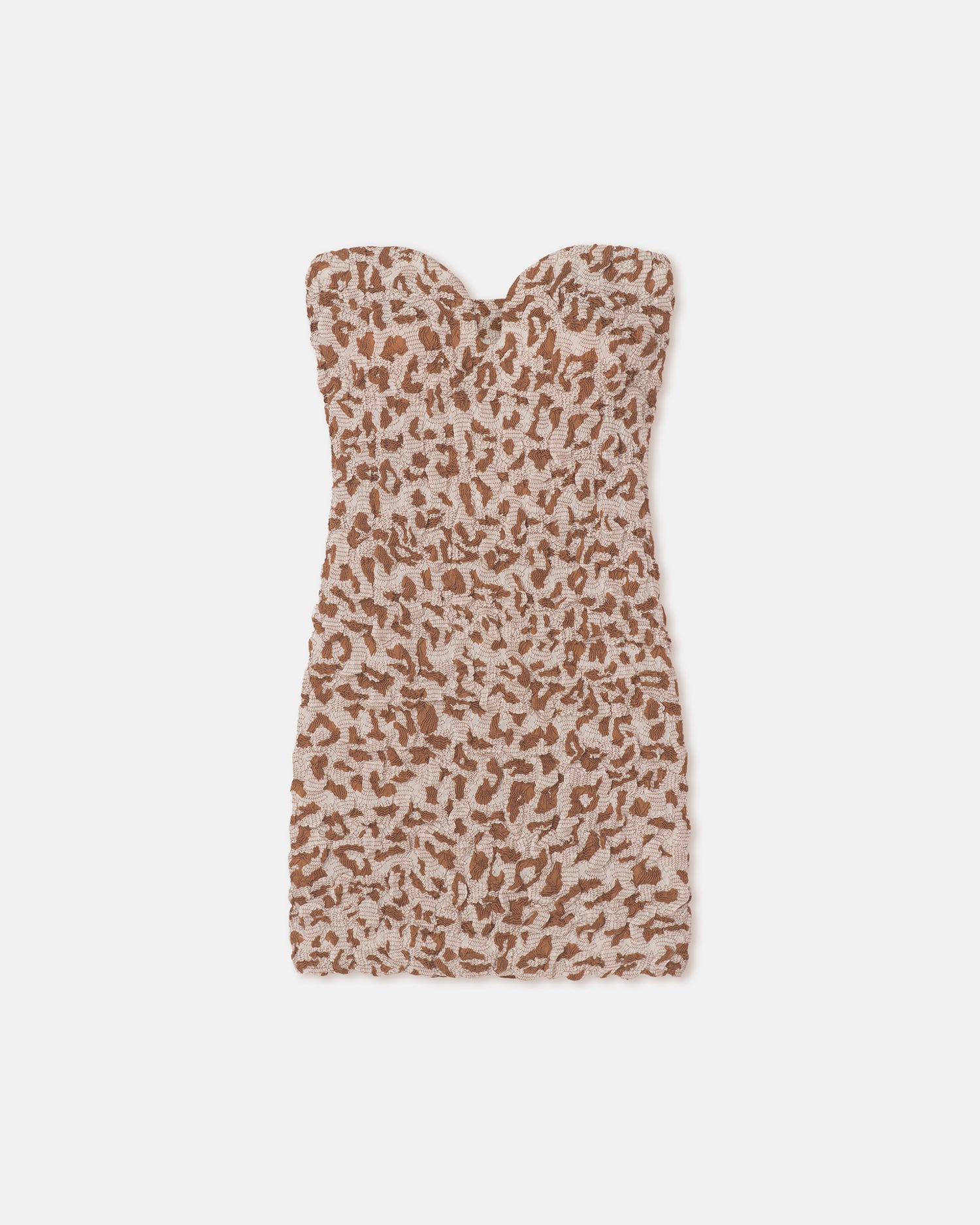 The Jannika dress demonstrates our innovative craft techniques with a new, textured fabrication. Made from ocelot-printed seersucker cotton voile, it has a halterneck sweetheart neckline and falls to a mid-thigh length.