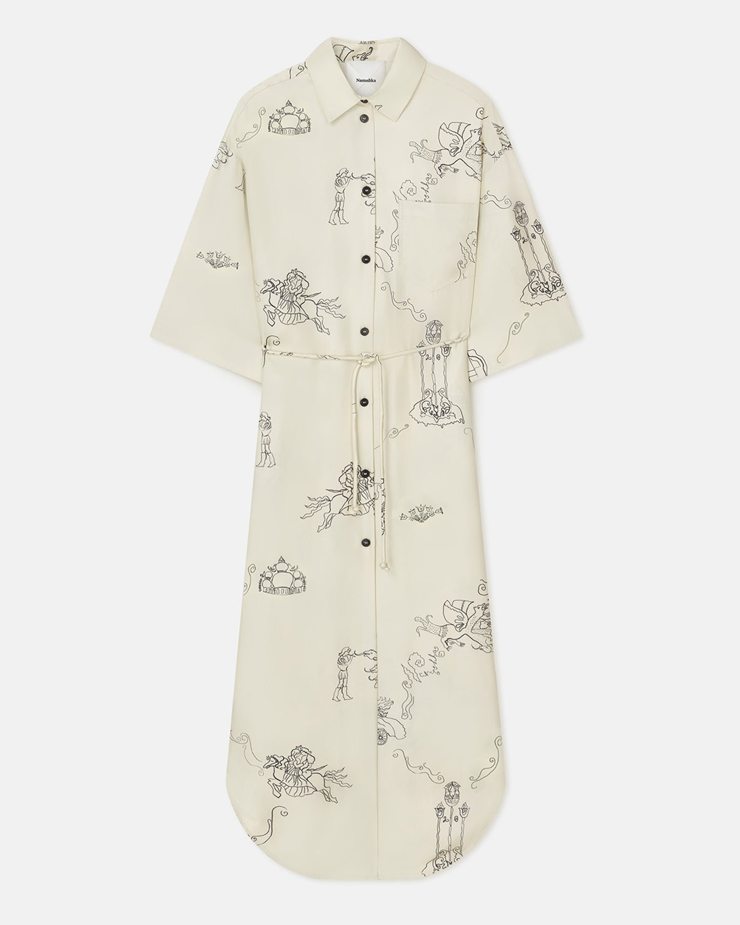 The Damala dress has a timeless shirt silhouette made from luxuriously lightweight silk twill. It’s decorated with our new-season Folktale print, a subtly expressive array of motifs, and has an oversized silhouette defined by wide sleeves and a waist-cinching belt.