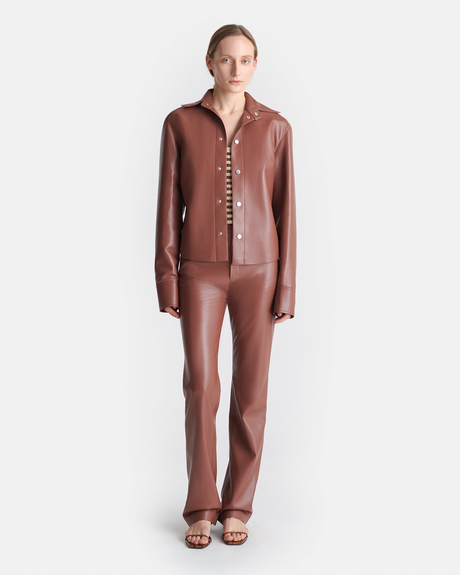 The Bogna shirt jacket is crafted from our exclusive OKOBOR™ alt-leather fabric and comes in a new henna tone for Spring/ Summer 2025. It has a slim fit so can be layered or worn on its own, and is detailed solely with silver hardware.