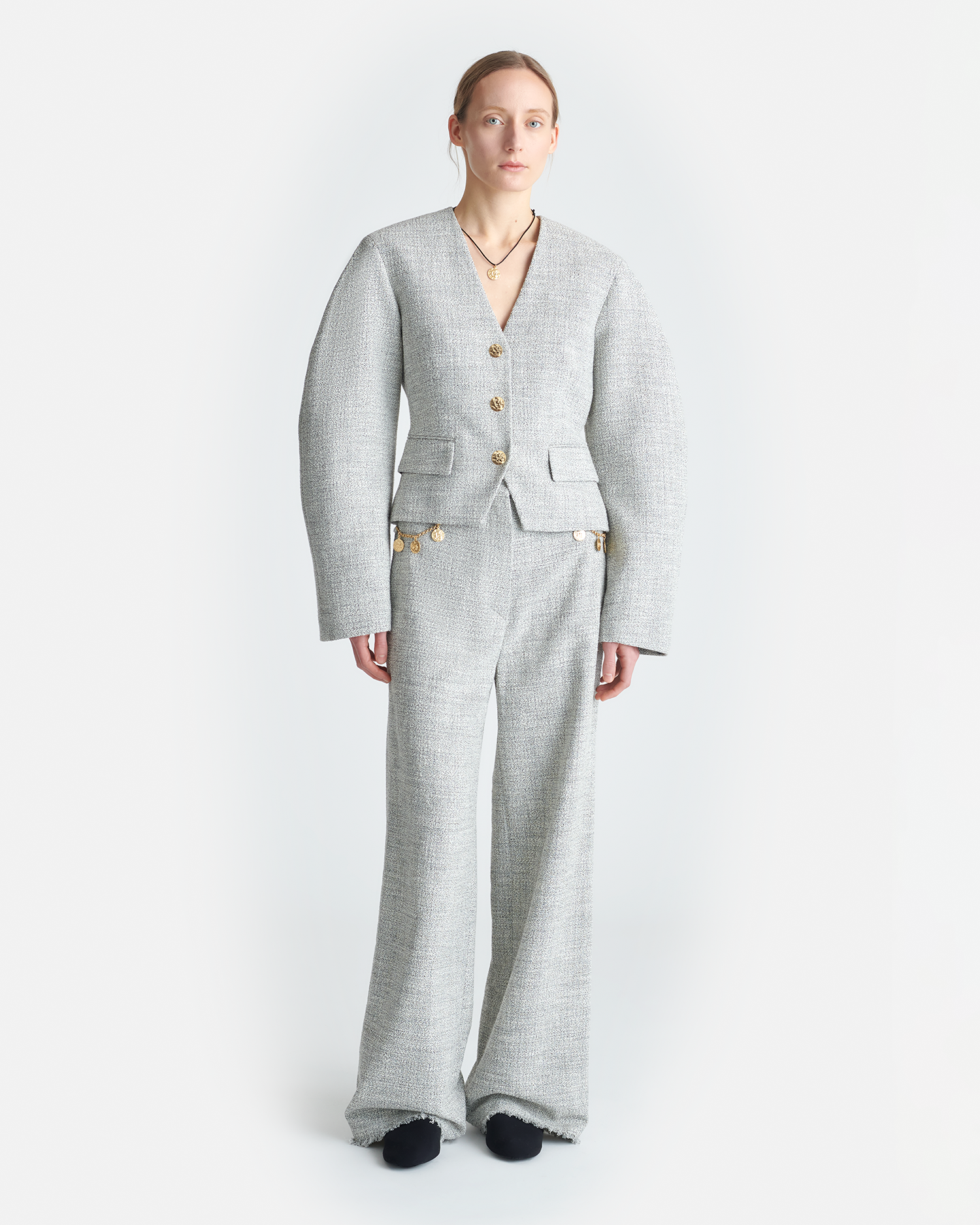 The Kiyo jacket is expertly tailored from mouliné tweed – tactility is an essential part of the Nanushka aesthetic. It feels fresh and contemporary thanks to the collarless design, cinched-in waist and rounded sleeves.